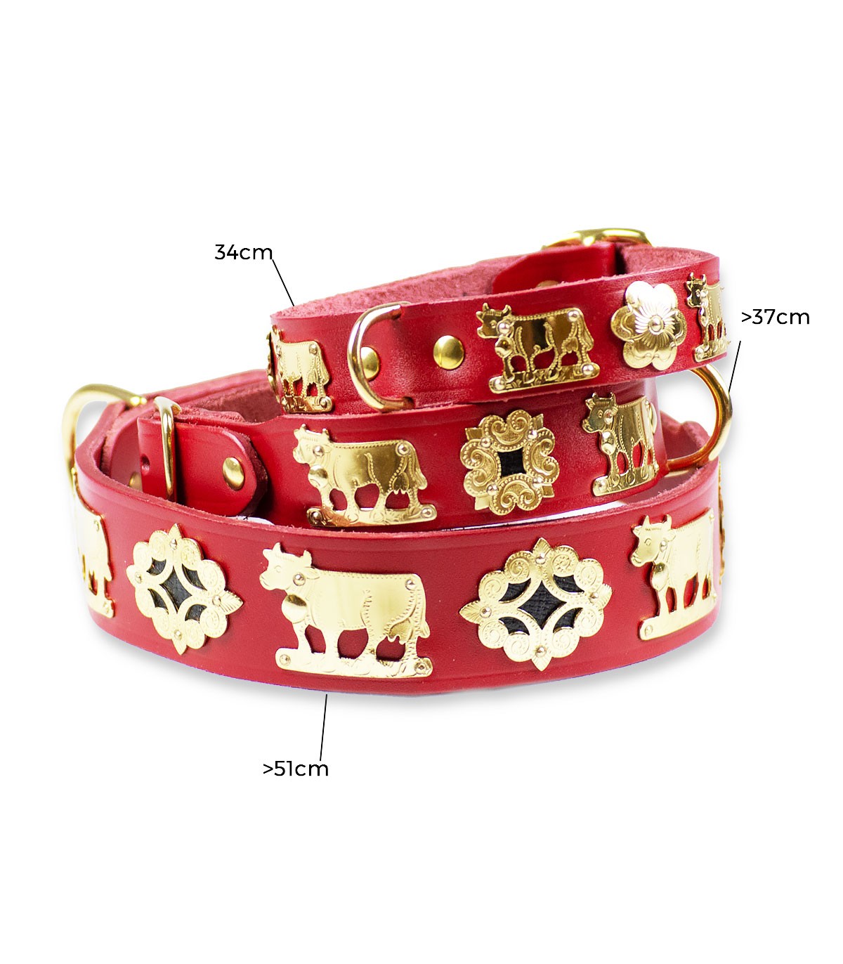 Collar for dogs from the brand Thildy. This collar, handmade in Switzerland with excellent cowhide, is the typical collar from that country with traditional Swiss brass ornaments.