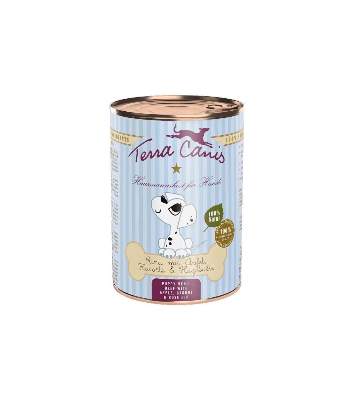 Terra Canis es comida húmeda para cachorros de alta calidad. Es una marca alemana, que produce sus alimentos en la Alta Baviera. Esta lata contiene comida 100% natural hecha a base de ternera, manzana y zanahoria, de la misma calidad que la comida para humanos. Tiene alto contenido en carne. Está indicada para perros de todas las razas y tamaños, y especialmente indicada para cachorros. Desarrollada por veterinarios.