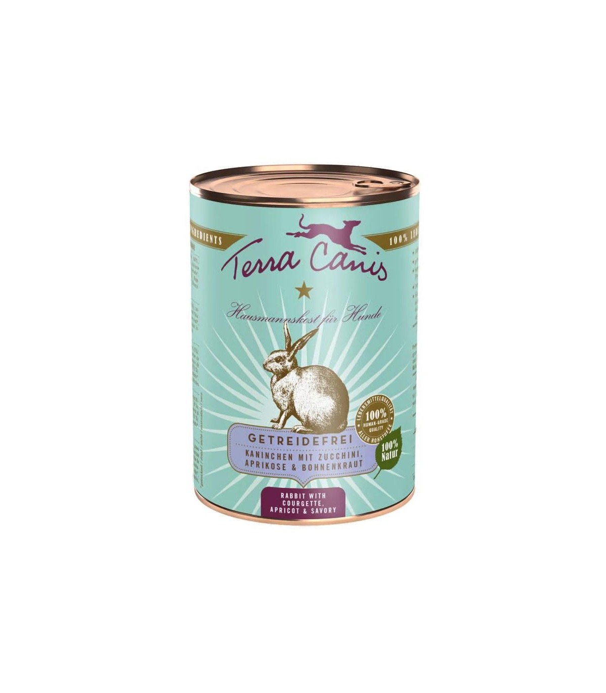 Terra Canis es comida húmeda para perros adultos de alta calidad. Es una marca alemana, que produce sus alimentos en la Alta Baviera. Esta lata contiene comida 100% natural hecha a base de conejo, calabacín, albaricoque y borraja, de la misma calidad que la comida para humanos. Tiene alto contenido en carne y está libre de gluten. Está indicada para perros de todas las razas y tamaños, y especialmente indicada para perros con intolerancia a alimentos hechos de grano. Desarrollada por veterinarios
