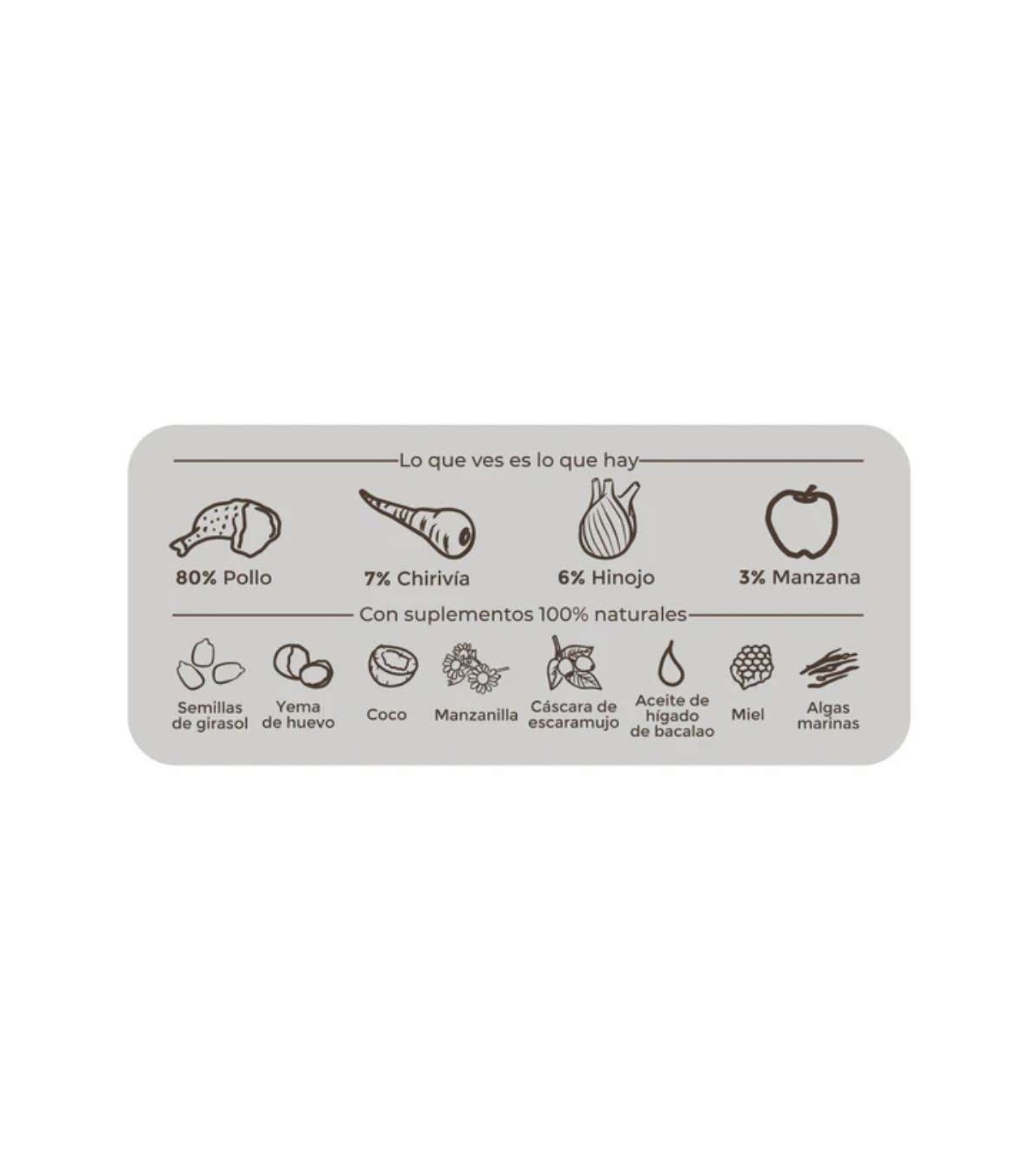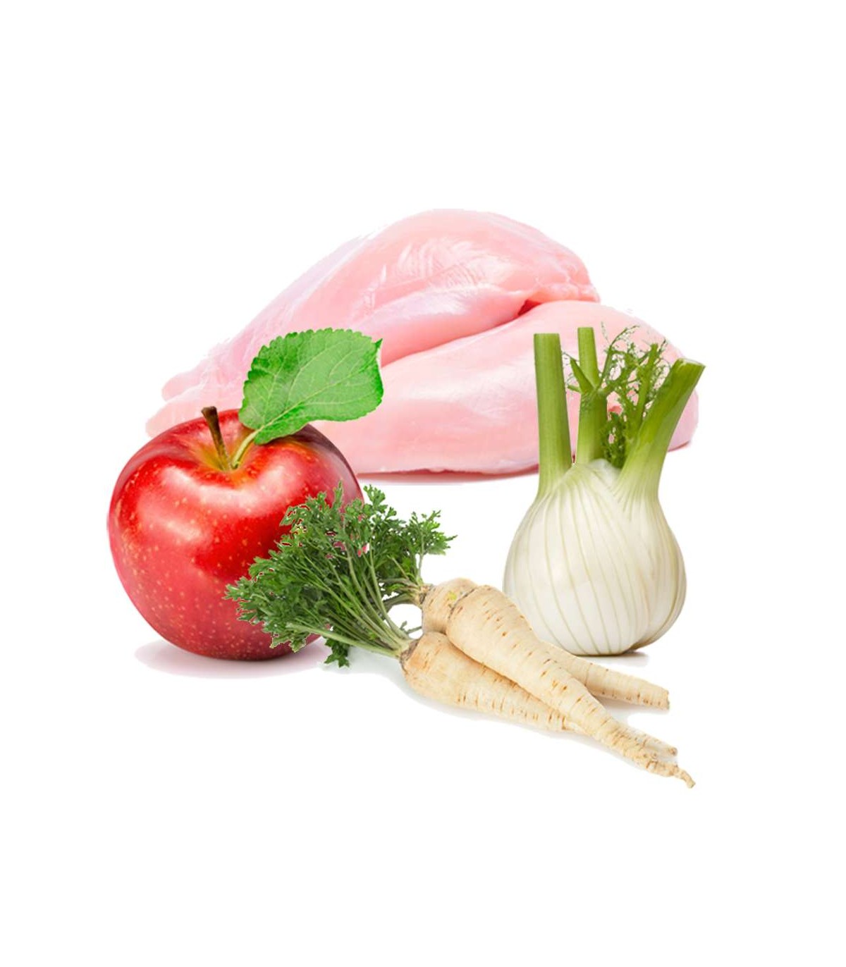 Composition: Chicken breast (42%)*, chicken carcass (12.6%)*, chicken heart (9.8%)*, chicken broth (9.4%)*, parsnip (7%)*, fennel (6%)*, chicken liver (5.6%)*, apple (3%)*, sunflower seeds*, egg yolk*, coconut*, chamomile*, rosehip shell*, cod liver oil, honey, ascophyllum nodosum (seaweed)*