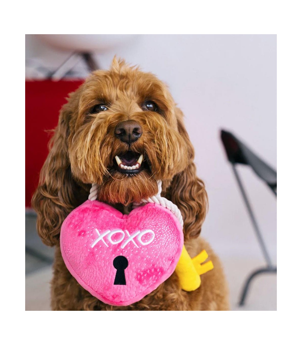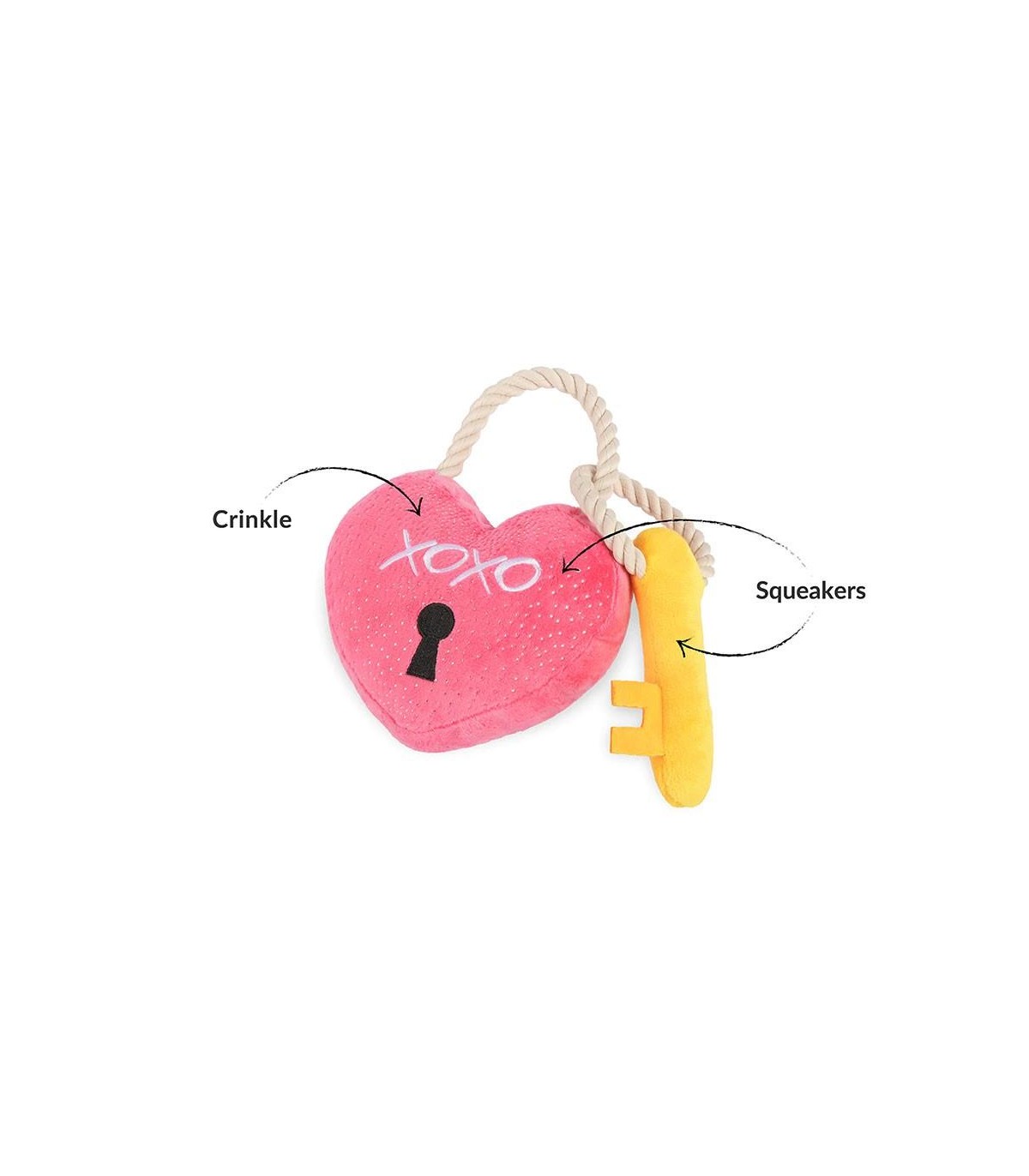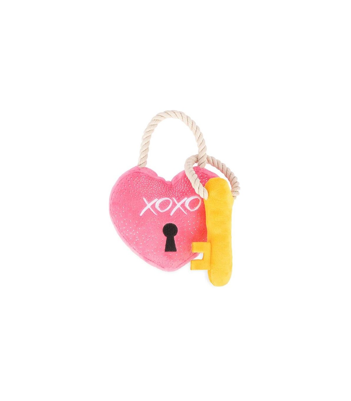 The best way to celebrate Valentine's Day with your furry friend. This heart-shaped padlock plush toy will be the perfect toy. It is very soft and plushy and can be played with as a plush toy, but it has a small squeaker both in the heart and in the key. The inside has plastic that crinkles with a bite making it even more entertaining, like the rope on both ends of each plush. You can throw it or tug on it to play with your dog.