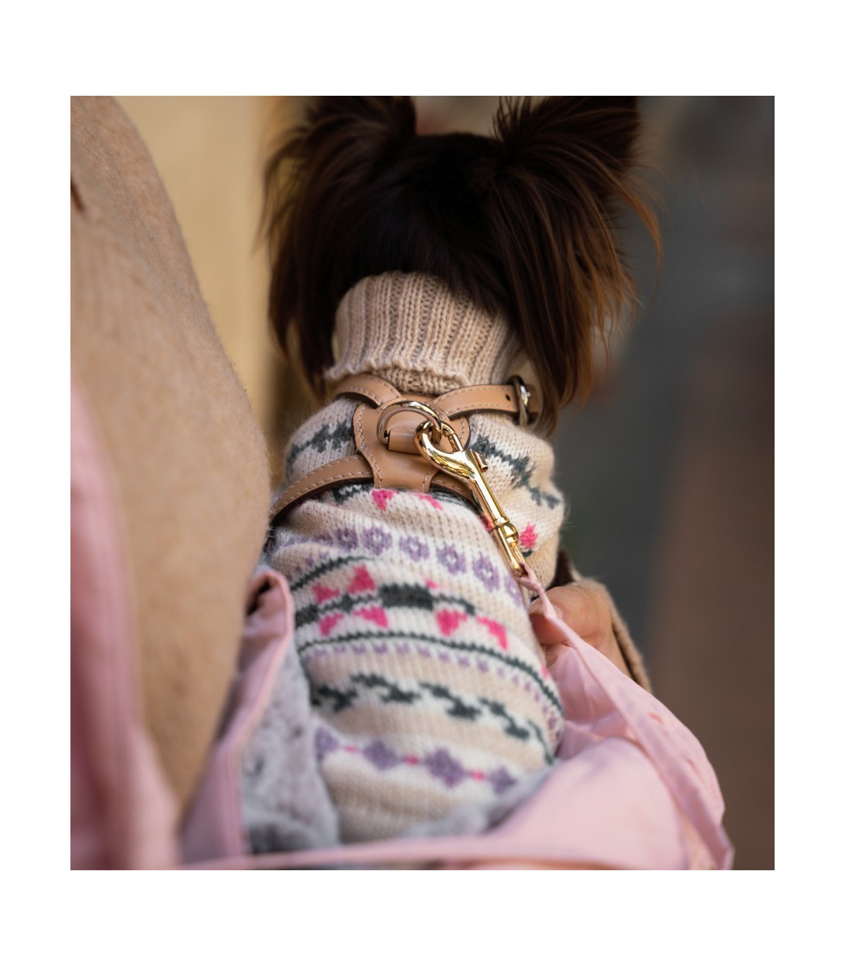 Your dog's harness or collar can be worn underneath the sweater, as it includes an opening for easy leash attachment.