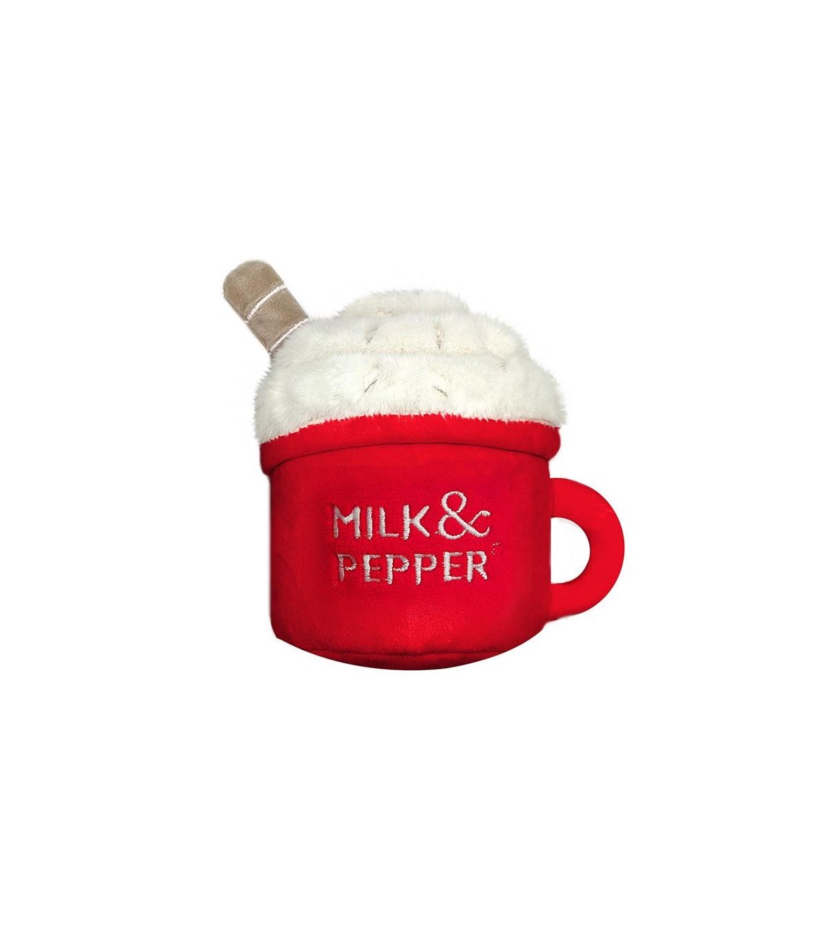 This plush toy in the shape of a coffee cup is covered with a very soft and pleasant-to-the-touch synthetic fur fabric. Along the edge, simulating whipped cream, the fabric is even softer and has small glitter details. The plush toy includes a squeaker, not too loud, for entertainment when squeezed.