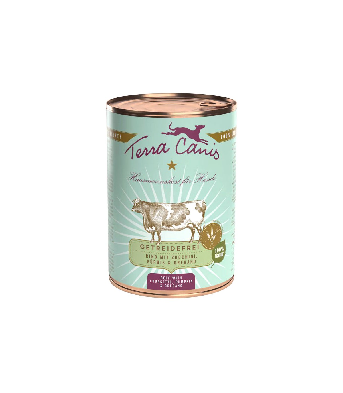 Terra Canis is high quality wet food for adult dogs. It is a German brand, which produces its food in Upper Bavaria. This can contains 100% natural food made from beef, zucchini, pumpkin and oregano, of the same quality as human food. It is high in meat and gluten free. It is indicated for dogs of all breeds and sizes, and especially indicated for dogs with intolerance to foods made from grain. Developed by veterinarians.