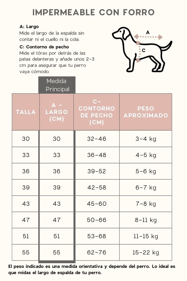 Available in various sizes to fit different dog sizes. Consult the specific SIZE GUIDE for this raincoat to choose the right size for your dog. Remember that the main measurement is the length of the back, not including the neck or tail.