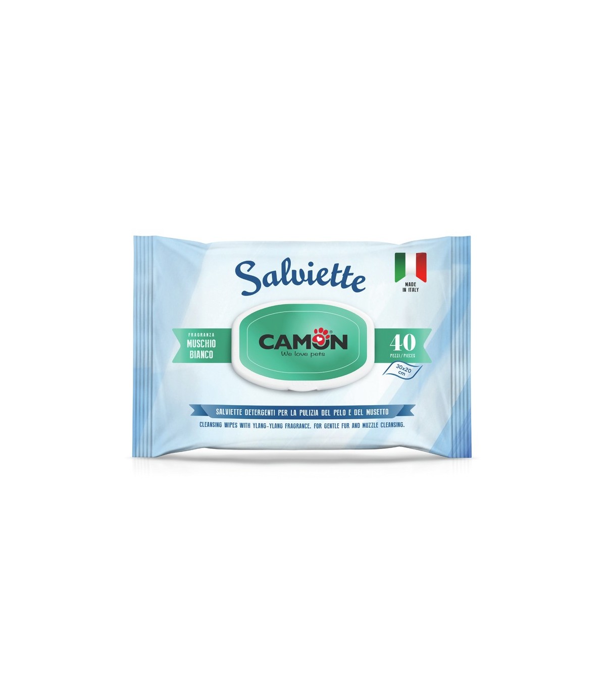Wet wipes for dogs from the brand Camon. These wet wipes with a strong clean scent are ideal for cleaning white dogs on specific occasions: while traveling, when they come back from a walk, after eating... Besides leaving them clean, they will also smell amazing! Contains 40 wipes of 30 x 20 cm.
