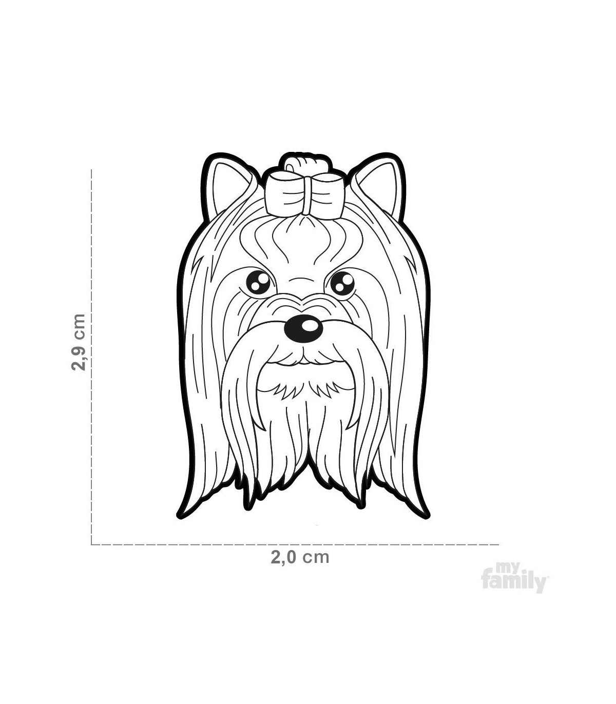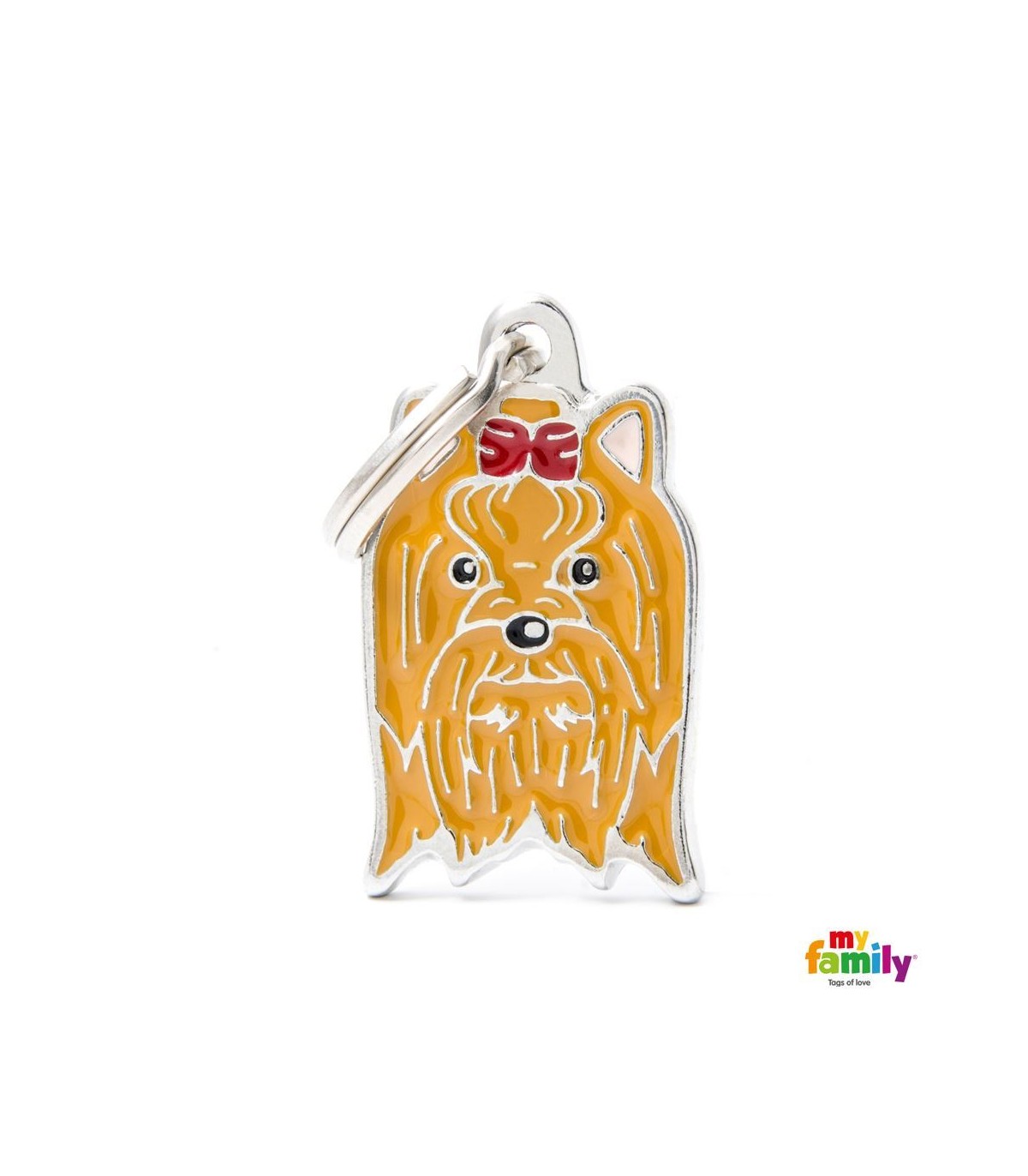 Identification tag from the My Family brand with a portrait of a Yorkshire Terrier. It is hand-enameled and made with hypoallergenic materials. Thanks to this tag, your dog will be well identified by having their information on their collar or harness. Customizing the tag is FREE! You can engrave up to 3 lines on the back (pet's name, phone number, etc.), however, due to its size, we recommend customizing it with a maximum of 2 lines. Just tell us what to put on each line in the PRODUCT CUSTOMIZATION fields and click on "Save customization" before adding the product to your shopping cart.