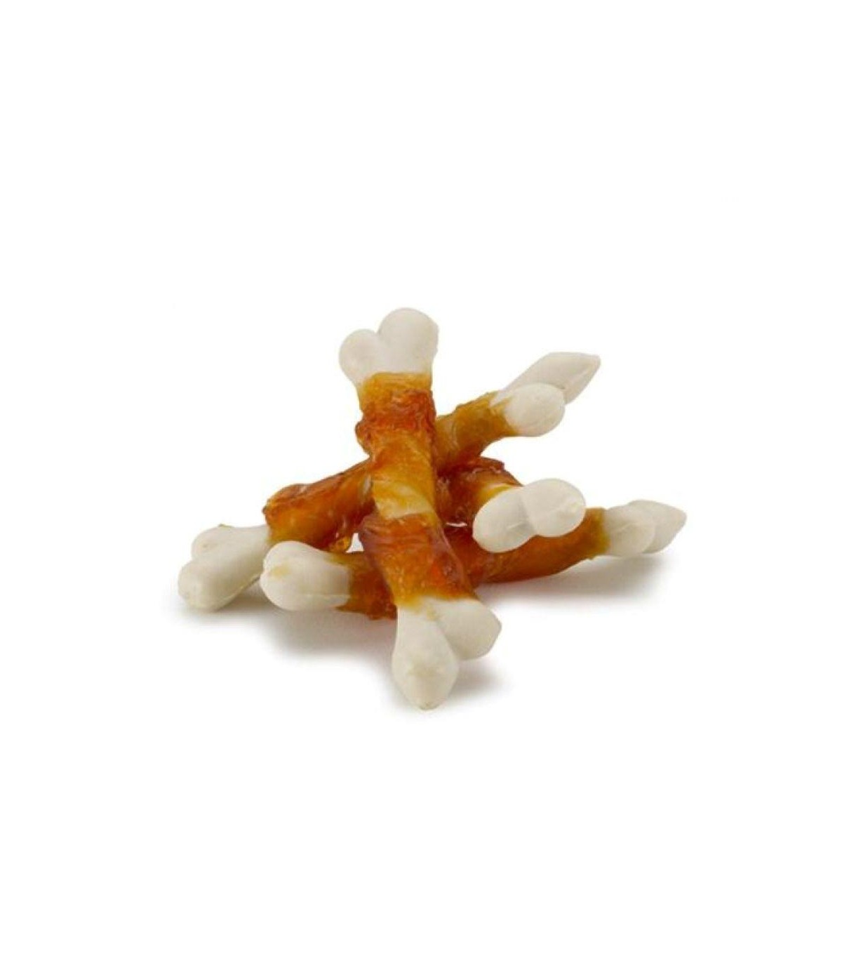 Snacks naturales de pollo y manzana deshidratados.