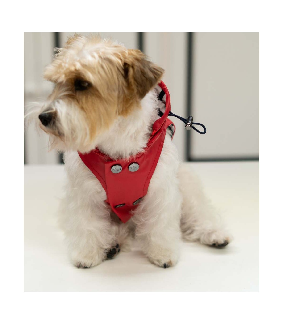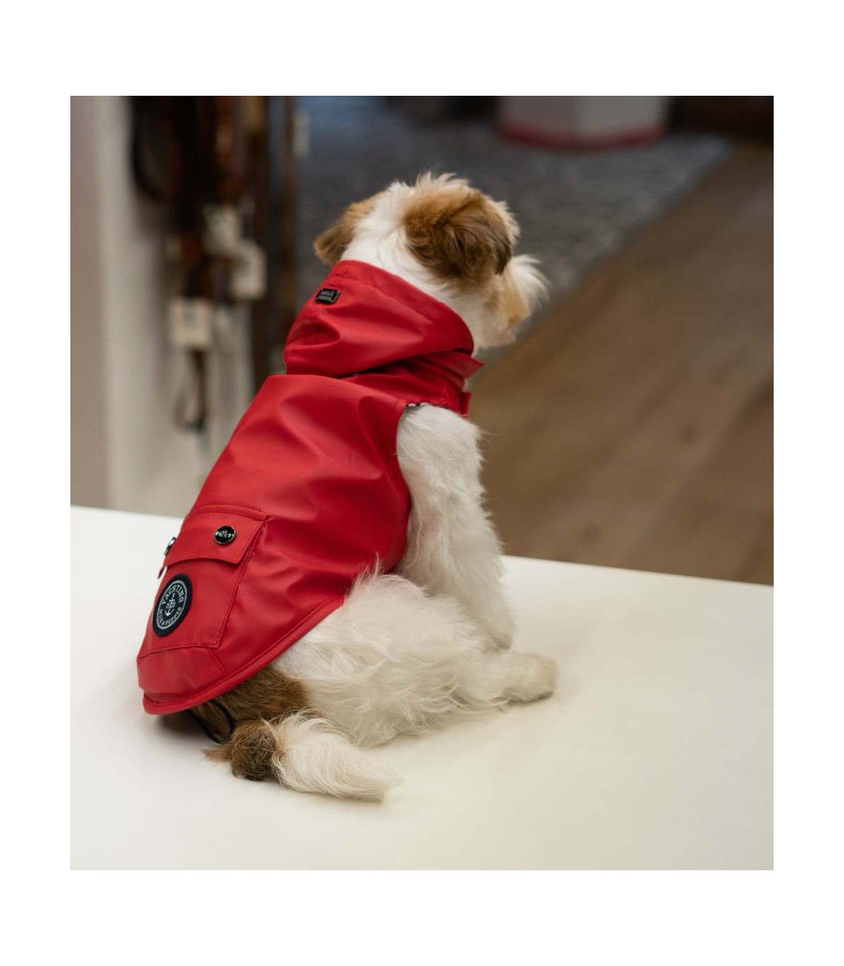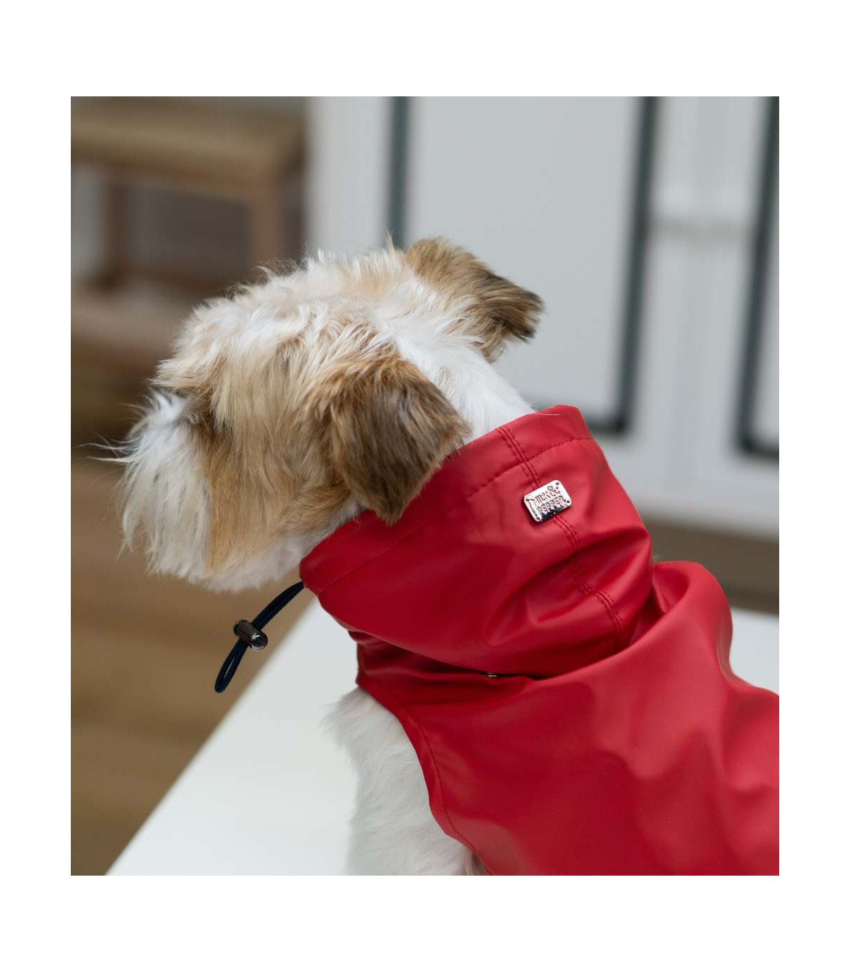 Este original impermeable rojo te permitirá que tu perro pasee bajo la lluvia sin mojarse el lomo ni el pecho.