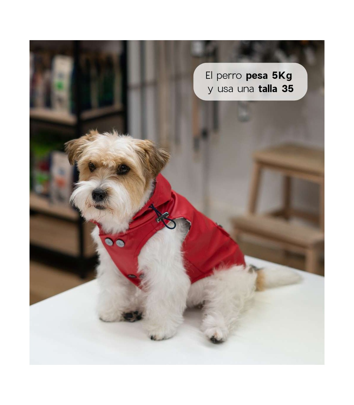 Disponible en distintas tallas -desde la 26 a la 45- para adaptarse a perros pequeños y medianos. Consulta la GUÍA DE TALLAS específica de este impermeable para que aciertes a la primera con la talla de tu perro.