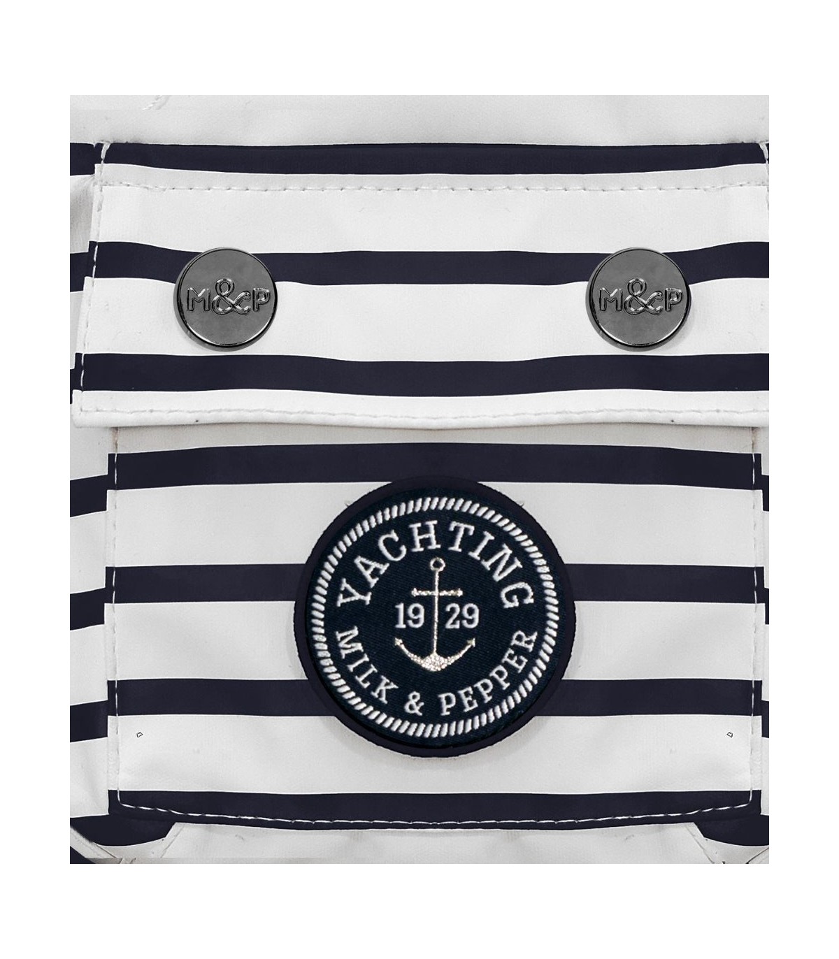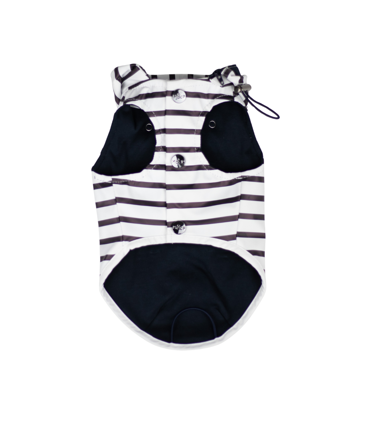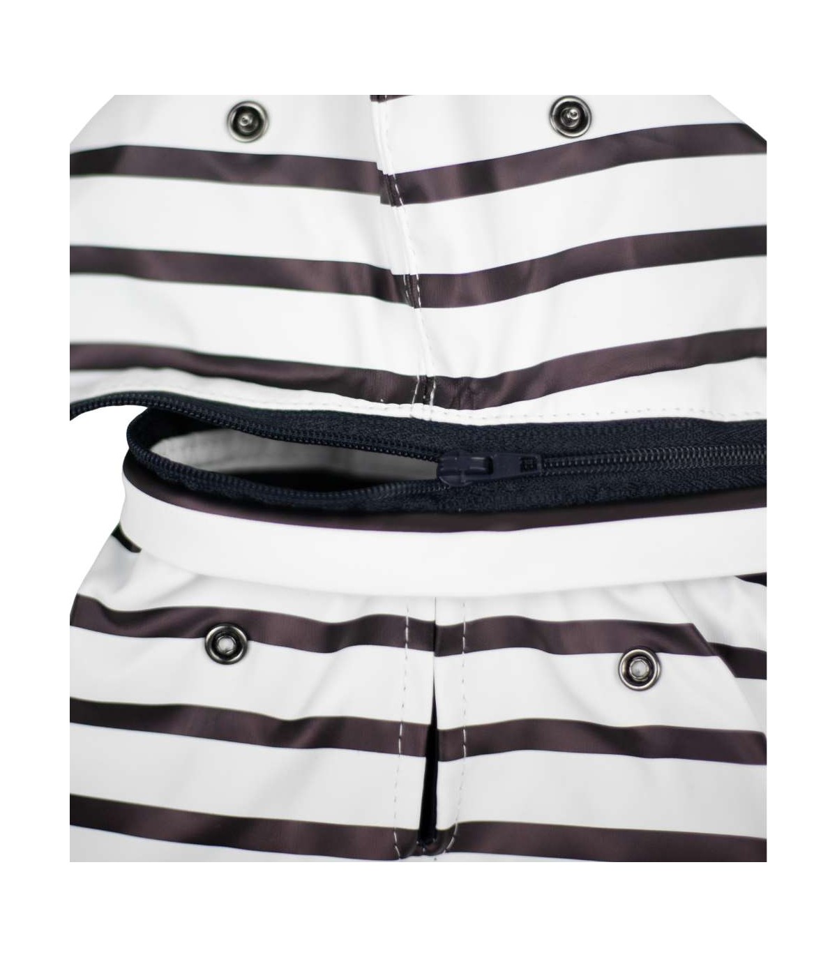 El impermeable está forrado con un tejido muy suave a rayas azules y blancas. Así será mucho más confortable para él.