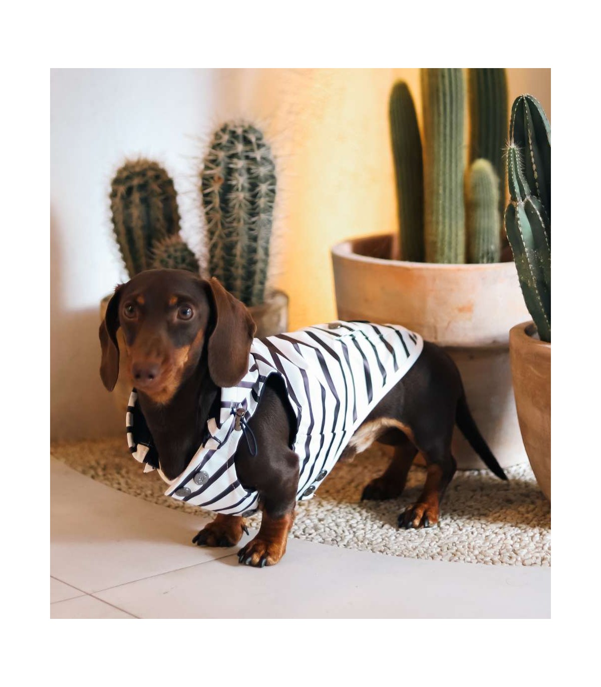 Este original impermeable de rayas permitirá que tu perro pasee bajo la lluvia sin mojarse el lomo ni el pecho.