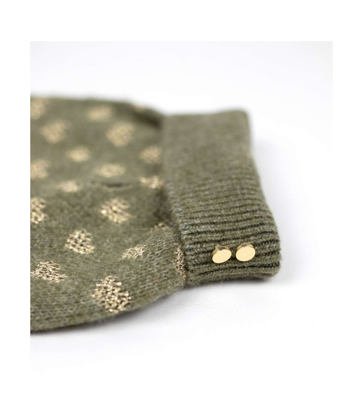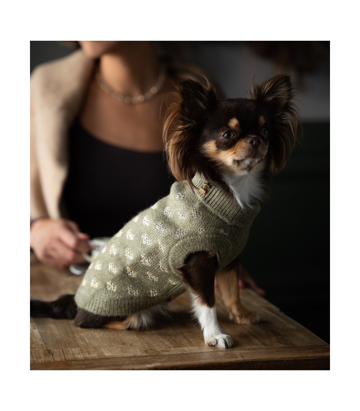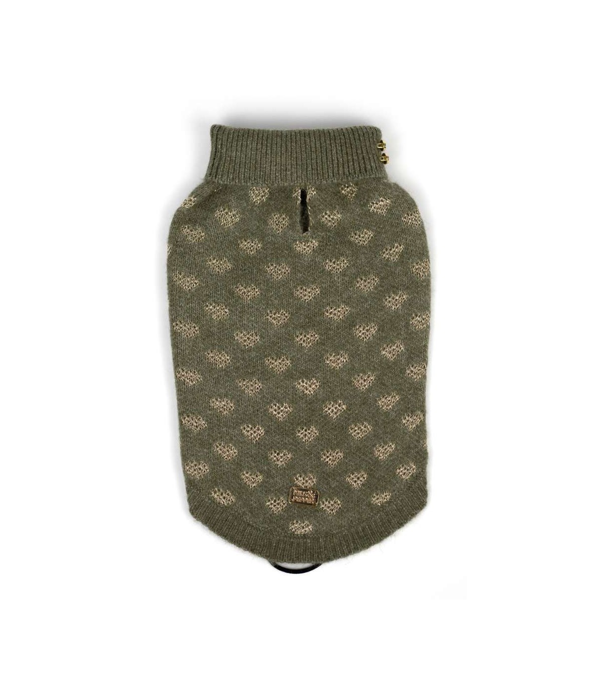 Jersey para perros pequeños de la marca Milk & Pepper en el color verde kaki y con corazoncitos en dorado.