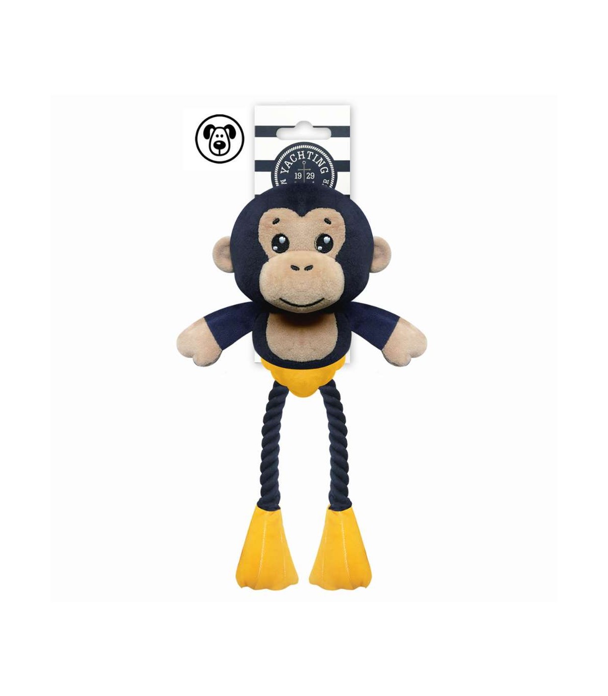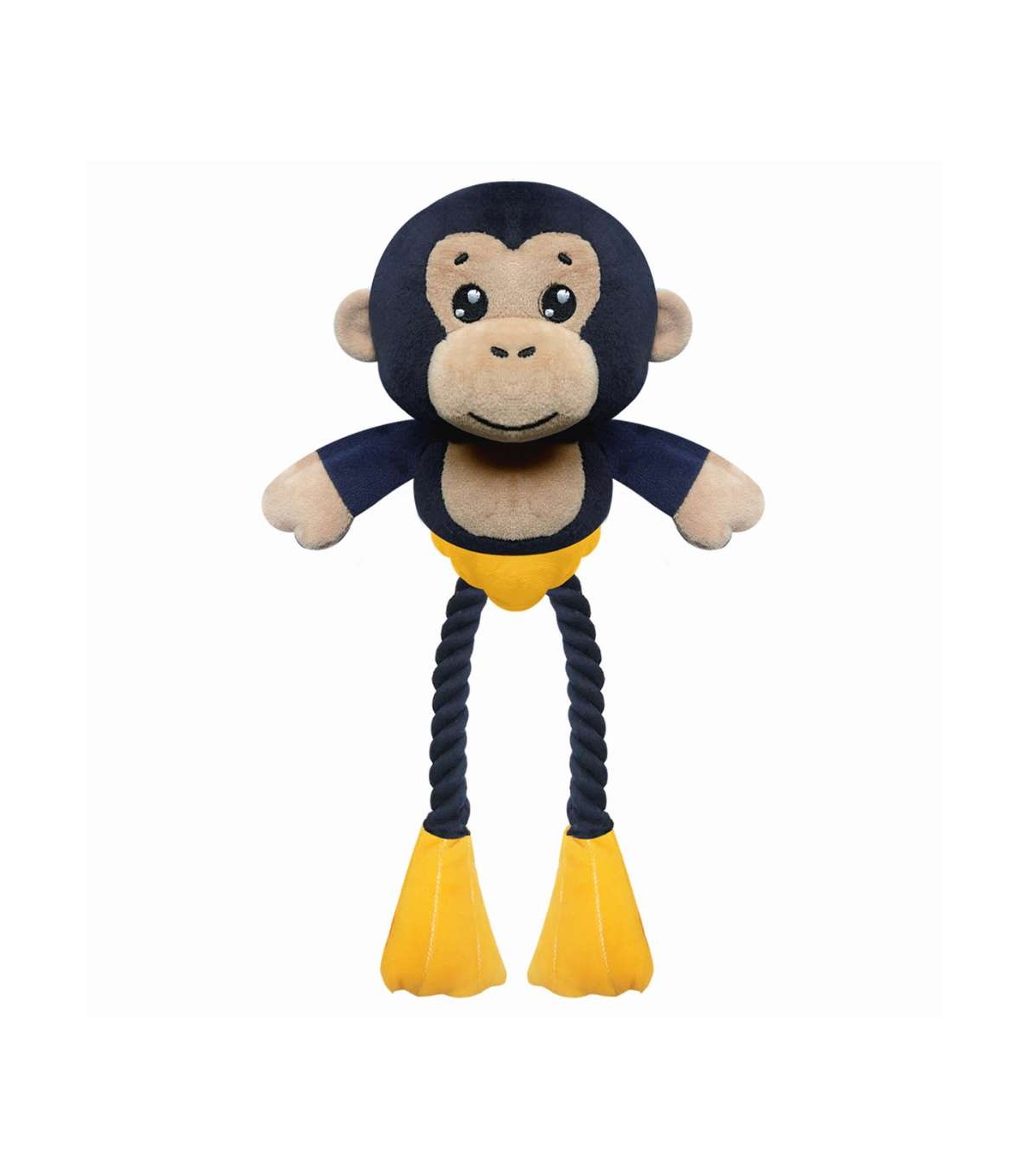 Te presentamos a Azel, un juguetón chimpancé en llamativo azul marino con cara en tono beige y características patas de cuerda trenzada en amarillo. Su combinación de peluche suave y patas de cuerda trenzada ofrece una experiencia de juego completa, perfecta para perros activos y curiosos. Diseñado para múltiples momentos de diversión: