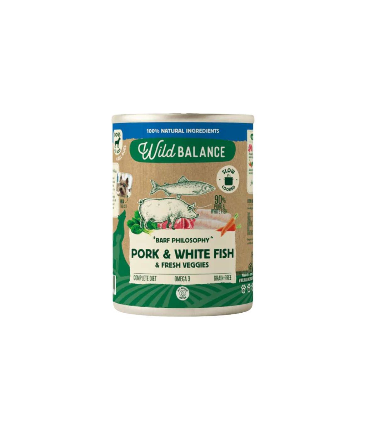 Lata de comida cocinada para perros de cerco y merluza de la marca Wild Balance.