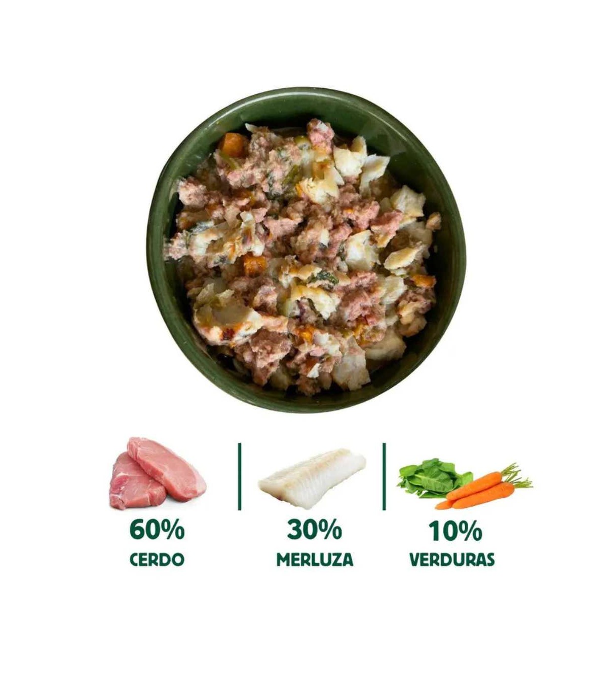 60% cerdo (45% carne picada de cerdo, 5% corazón de cerdo, 10% hígado de cerdo), 30% filetes de merluza, 7% zanahoria, 3% espinaca, vitaminas y minerales.