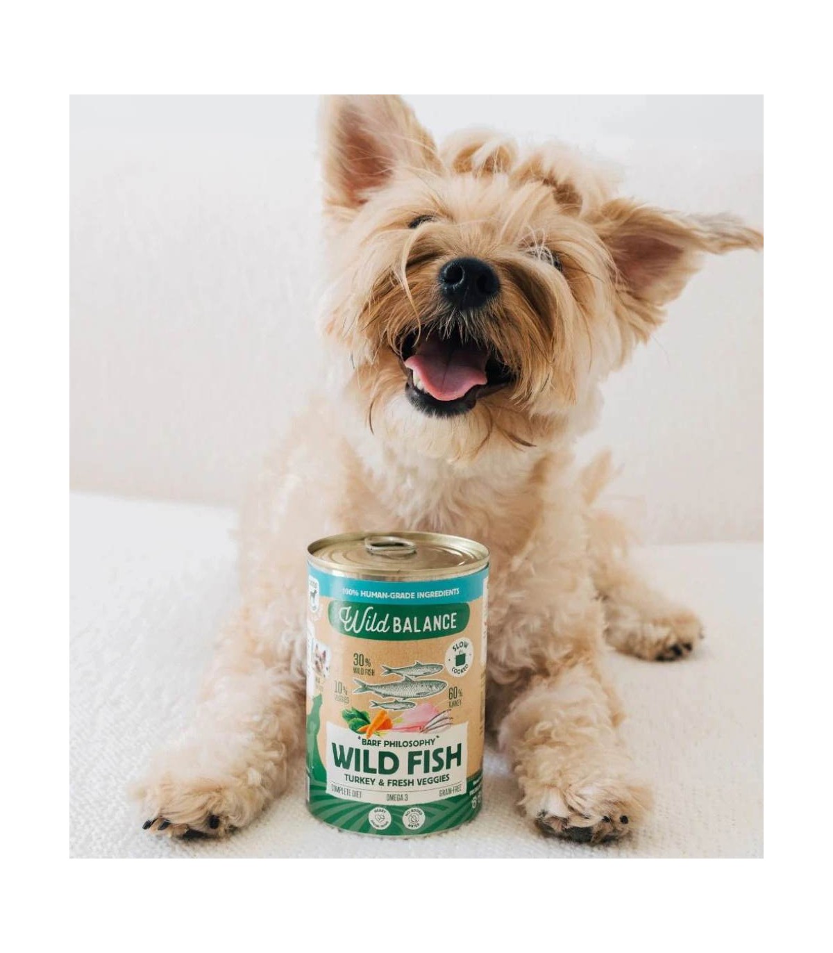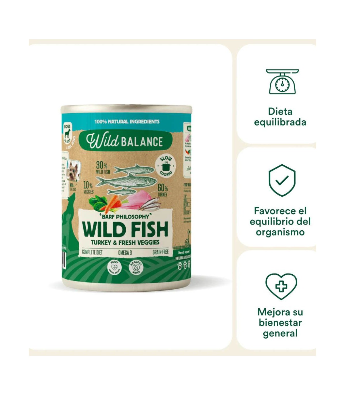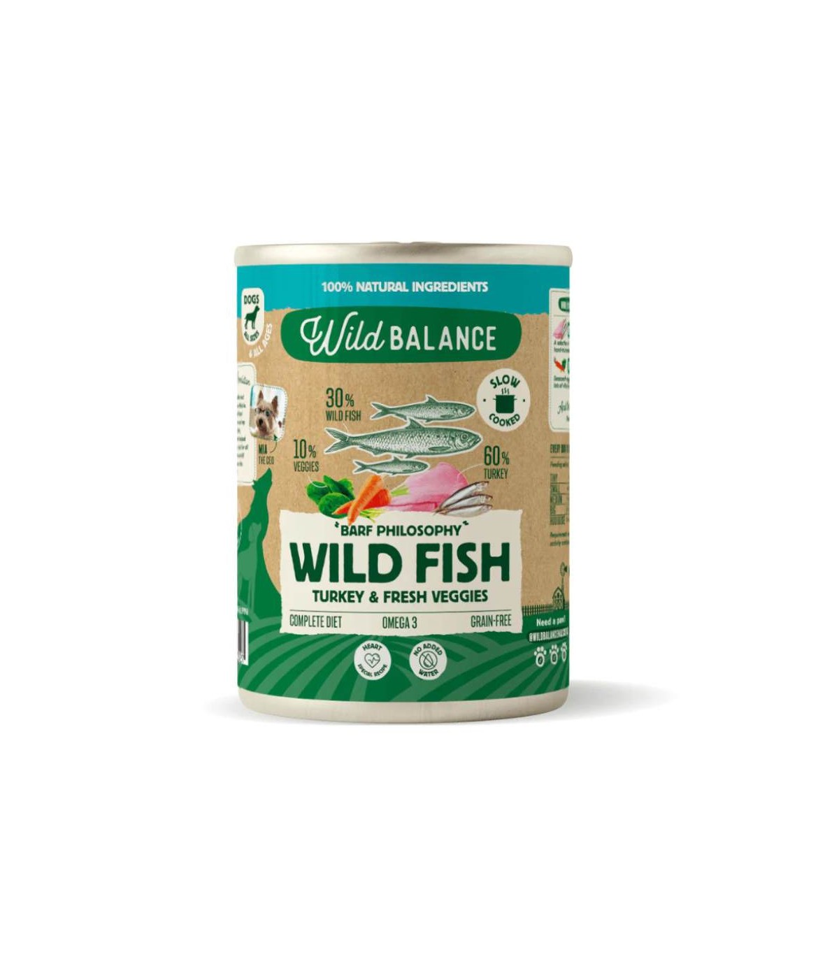 Lata de comida cocinada para perros de lata de comida cocinada para perros de pescado y pavo con verduras frescas de la marca Wild Balance.
