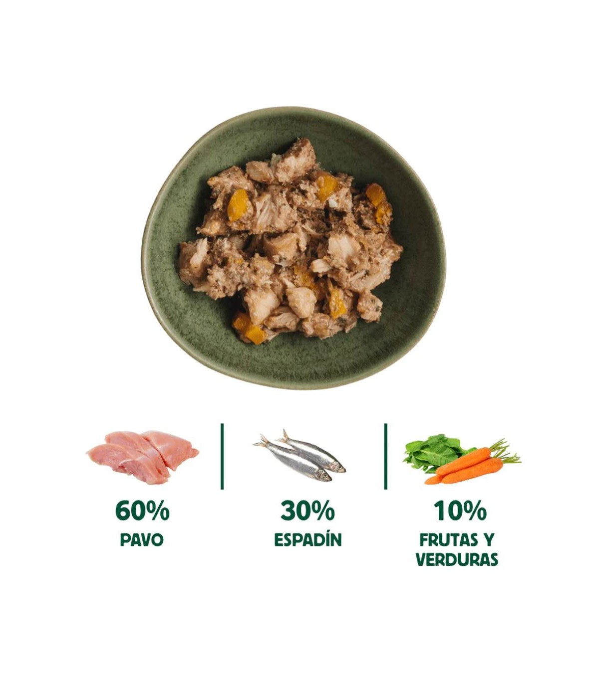 60% pavo fresco (45% pavo entero, 10% hígado de pavo, 5% corazón de pavo), 30% pescaditos salvajes (espadín), 7% zanahoria y 3% espinacas.