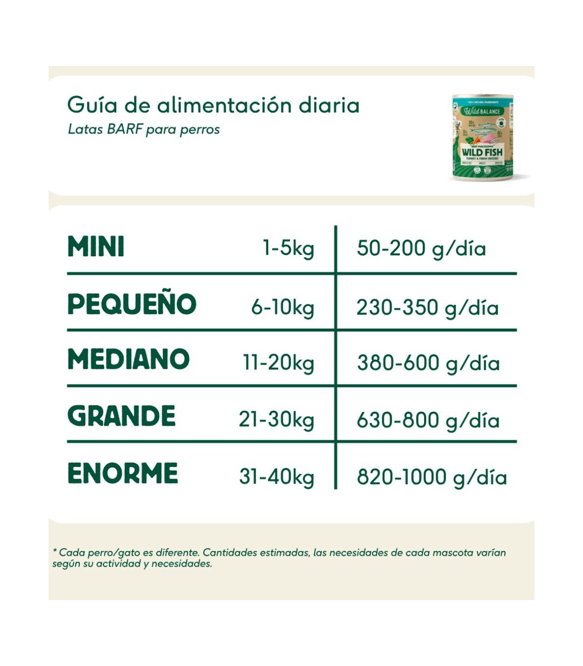 La ración es aproximada con lo cual, los valores deben ajustarse a cada perro (ejercicio, actividad, metabolismo...)