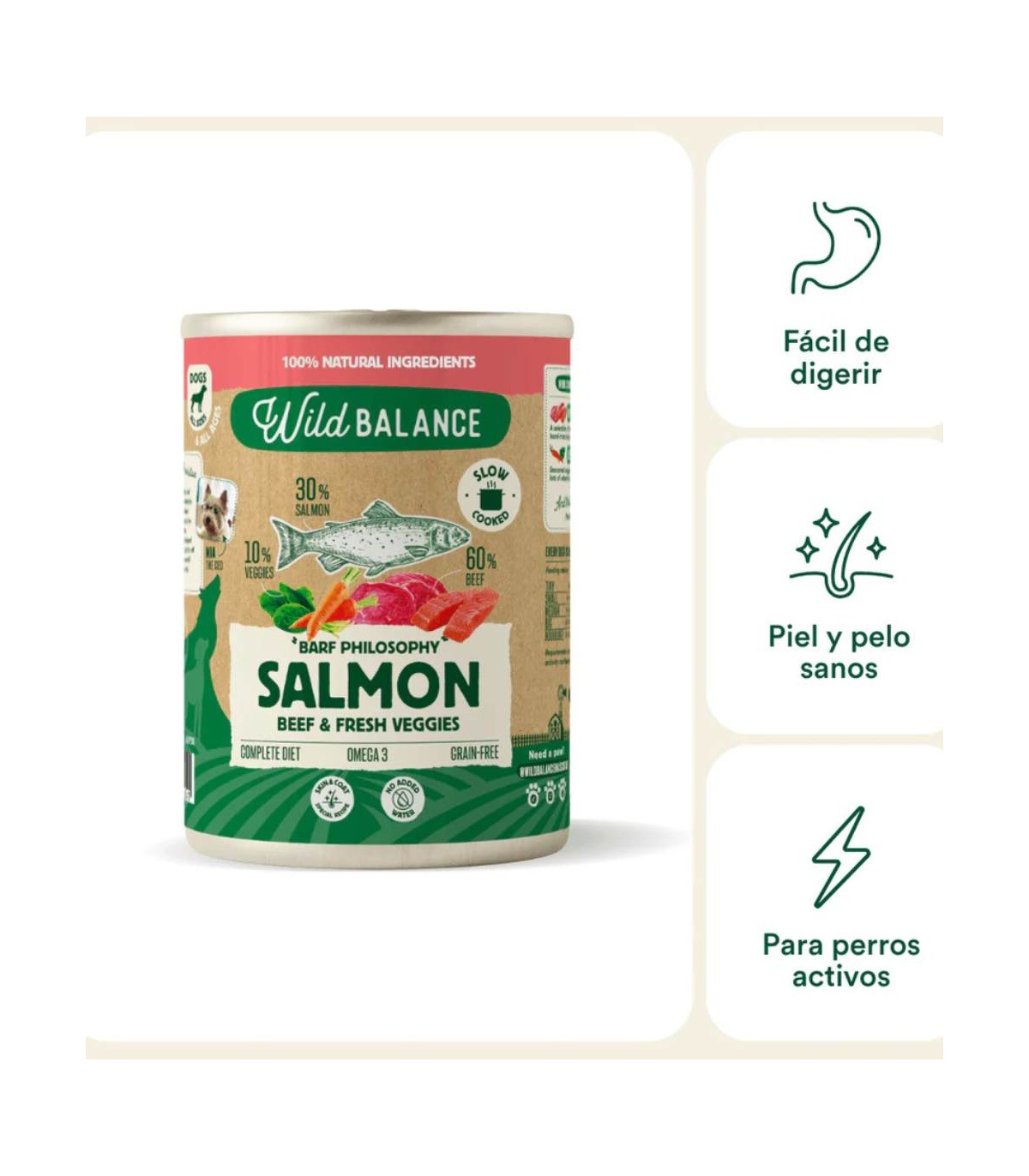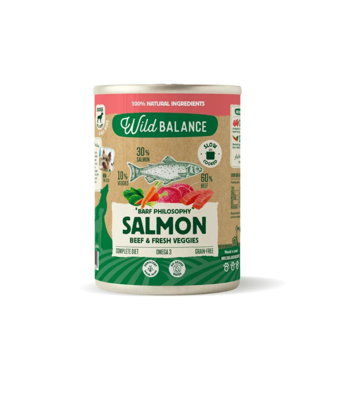 Lata de comida húmeda para perro de salmón y ternera de Wild Balance.
