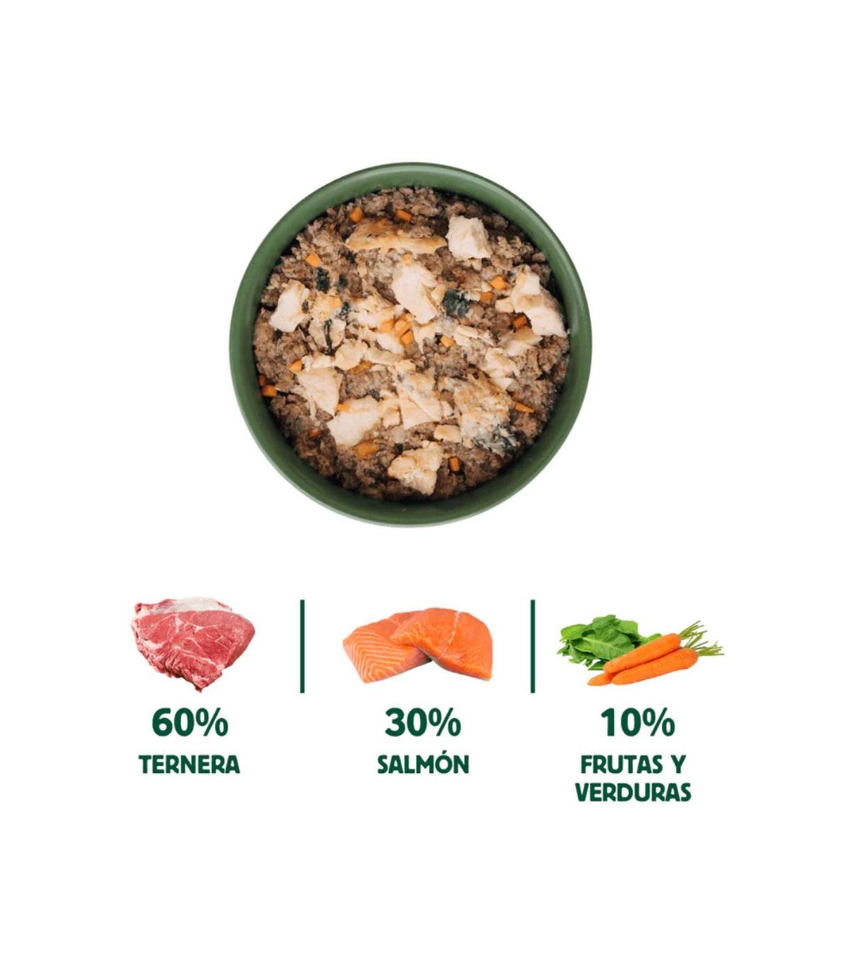 Ingredientes: 60% ternera (30% carne picada de ternera, 10% hueso con tuétano de ternera, 10% corazón de ternera, 5% hígado de ternera, 5% riñón de ternera), 30% salmón, 7% zanahoria y 3% espinaca.