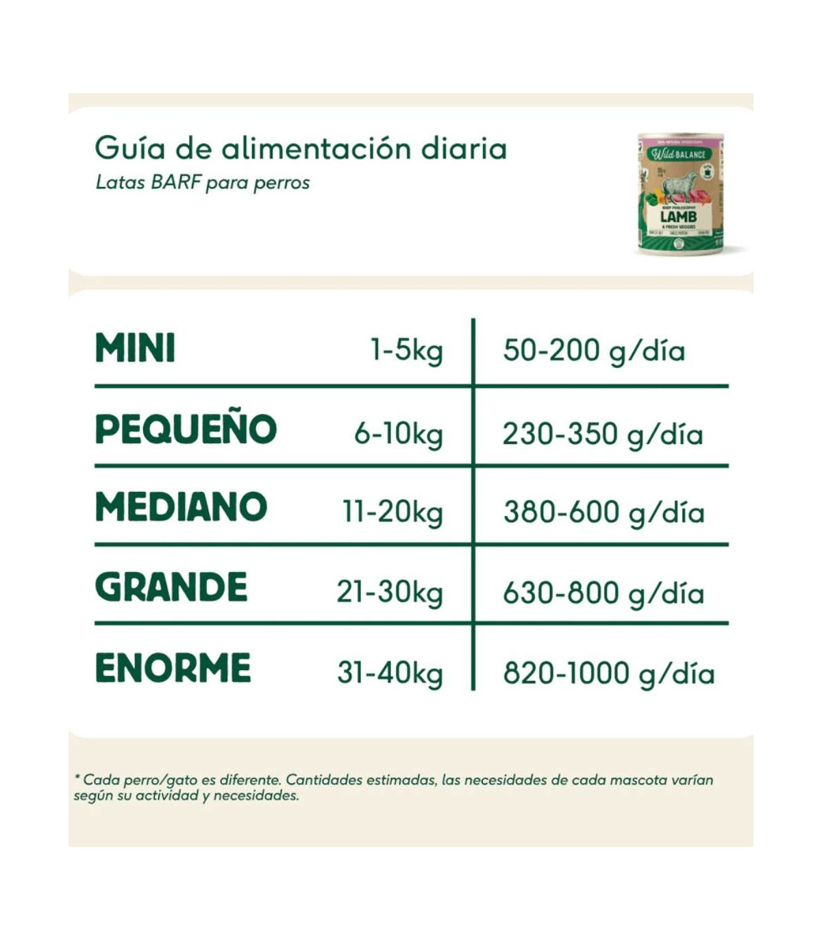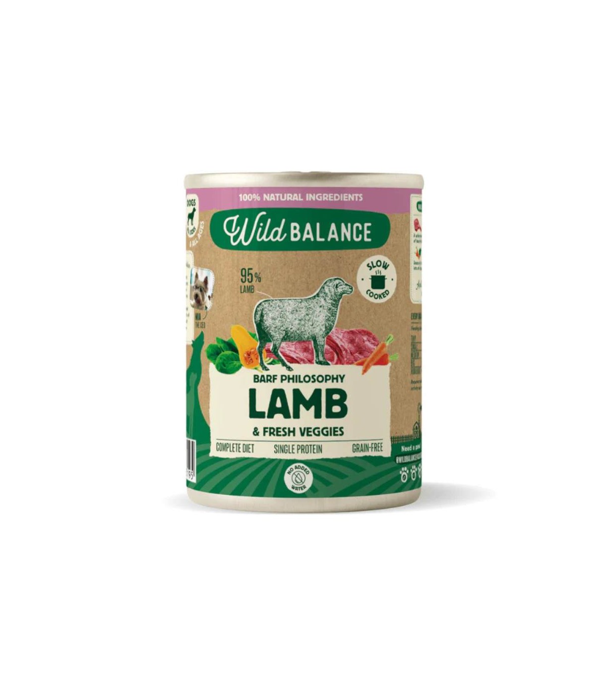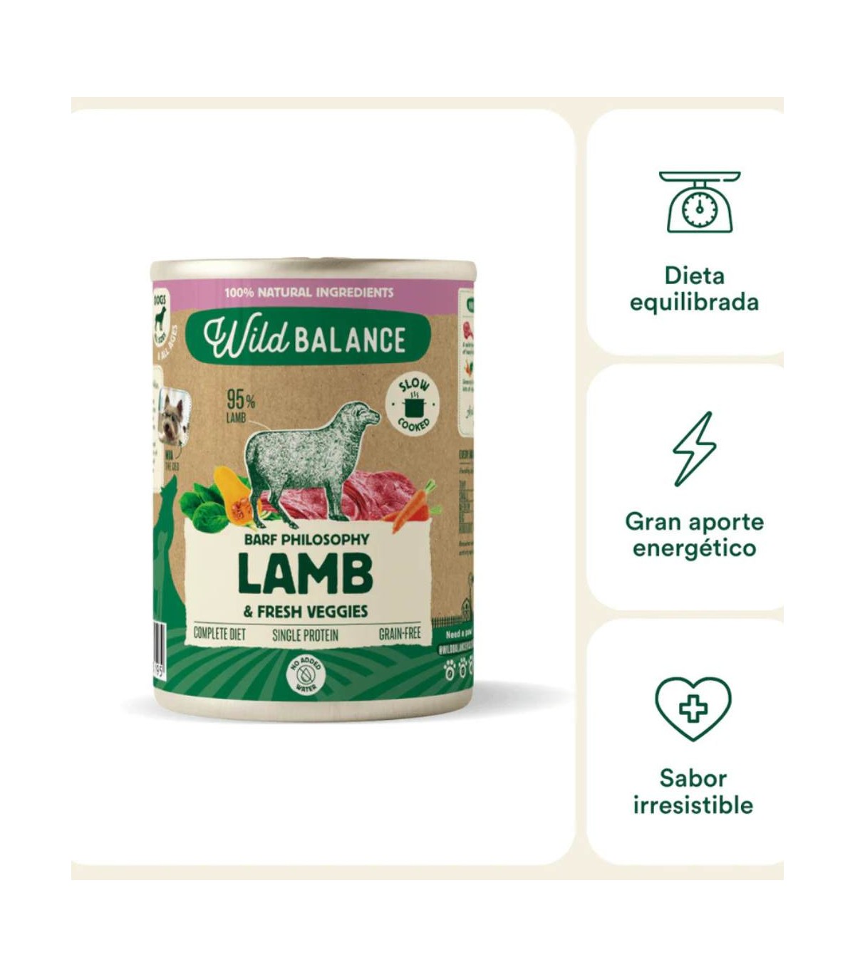 Lata de comida cocinada para perros de cordero de la marca Wild Balance.