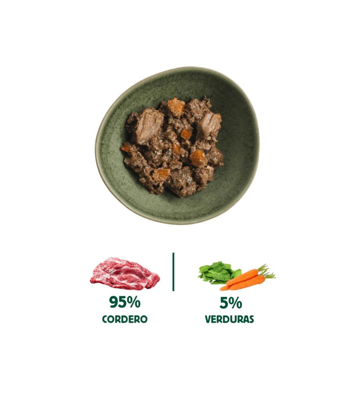 Es una receta completa, sabrosa y con una textura irresistible que encantará a tu peludo. Todas latas contienen ingredientes de calidad, con un alto porcentaje de carne y verduras (95,3% cordero, 1% calabaza, 1% zanahoria y 0,5% espinacas), cocinados a fuego lento y con mucho amor.