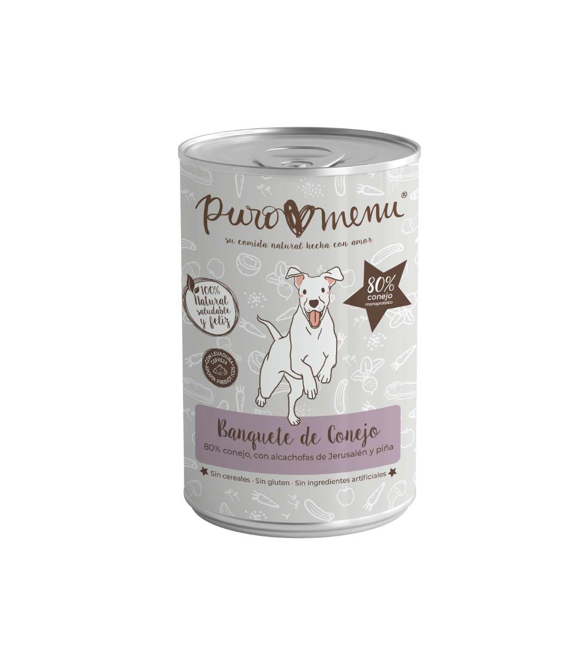 Alimento cocido premium, completo y equilibrado de la marca Puromenu. Este menú, formulado con un 80% de conejo y con alcachofas de Jerusalén y piña, será toda una delicia para tu perro.