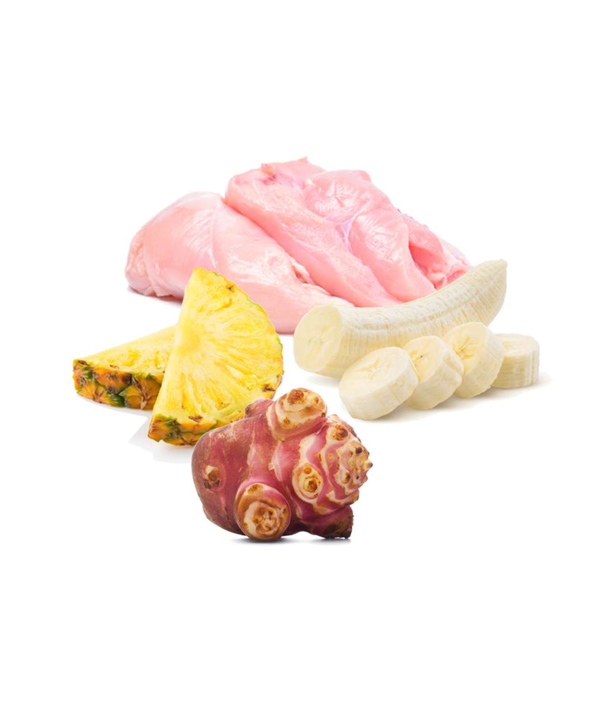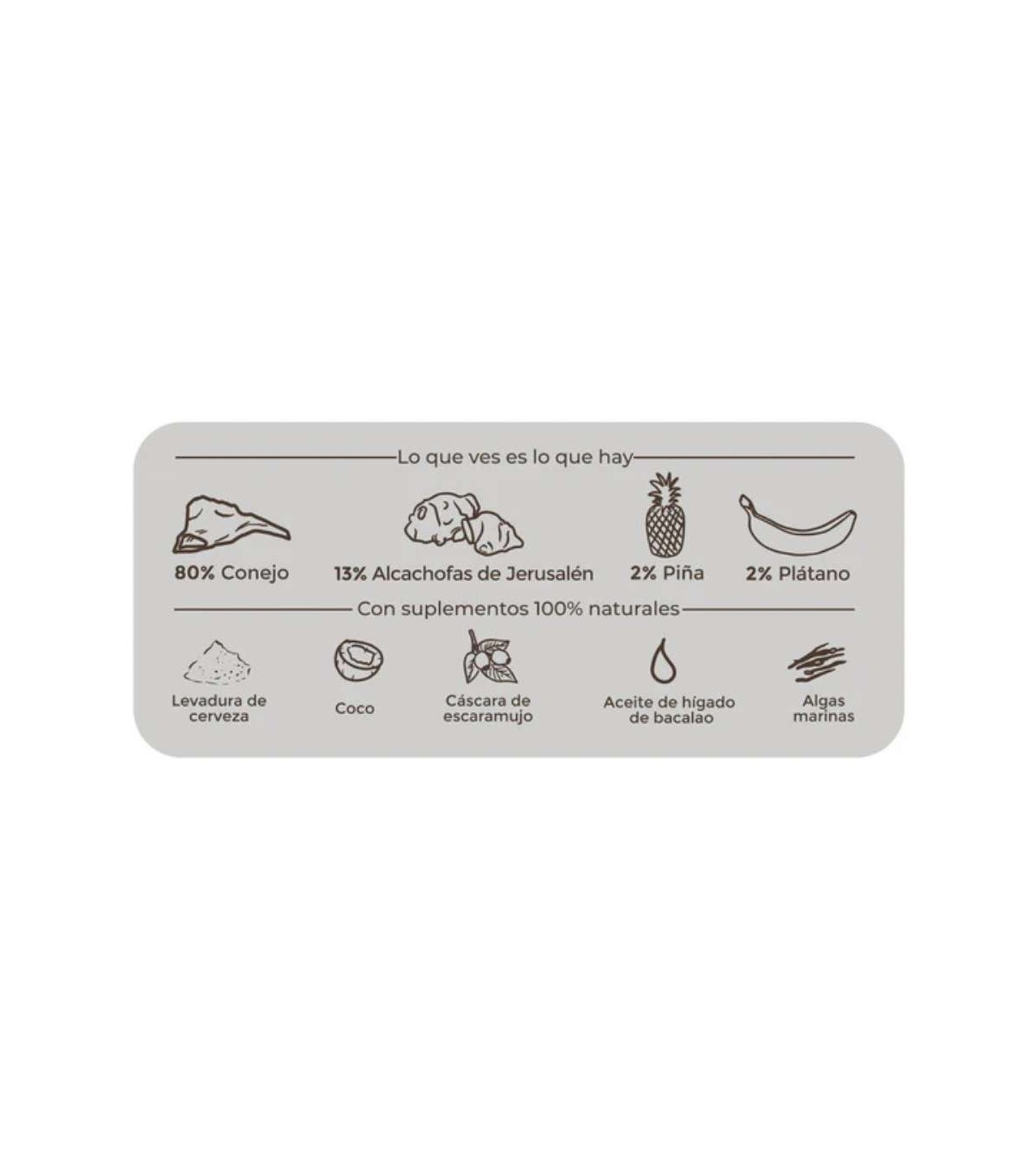 Composición: Conejo entero (70%)**, alcachofas de Jerusalén (13%)*, caldo de conejo (10,6%)**, piña (2%)*, plátano (2%)*, levadura de cerveza, coco*, cáscara de escaramujo*, aceite de hígado de bacalao, ascophyllum nodosum (algas marinas)*