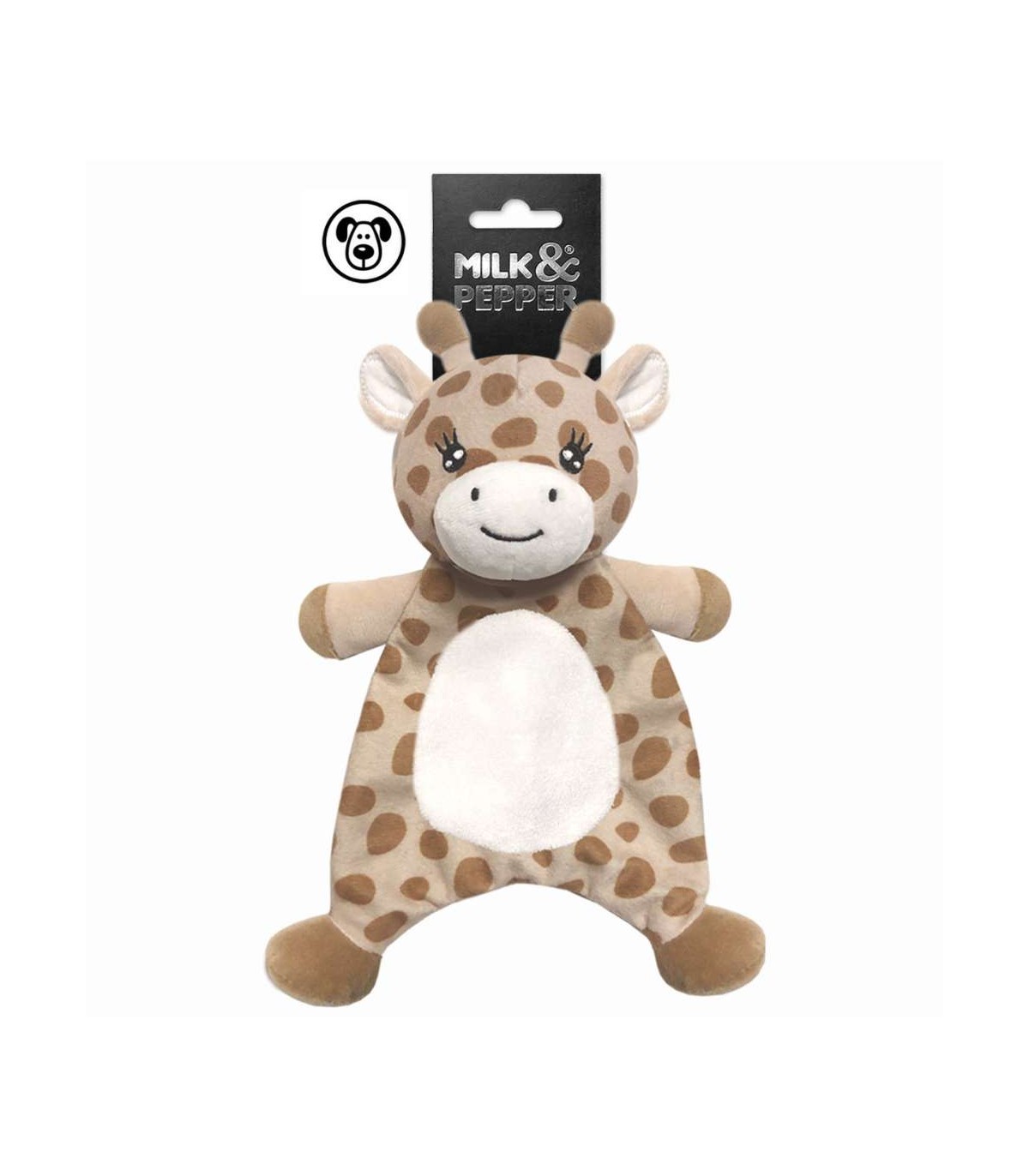 Este peluche con forma de jirafa es muy suave y blandito, con su característico pelaje camel salpicado de manchas marrones y su adorable carita. En la cabeza tiene un pito para que despierte la curiosidad de tu peludo. El cuerpo es de trapito, ideal para perritos que están acostumbrados a morder tejidos como vuestros calcetines :).