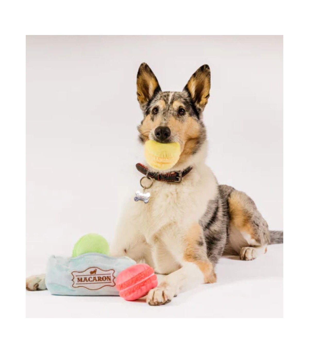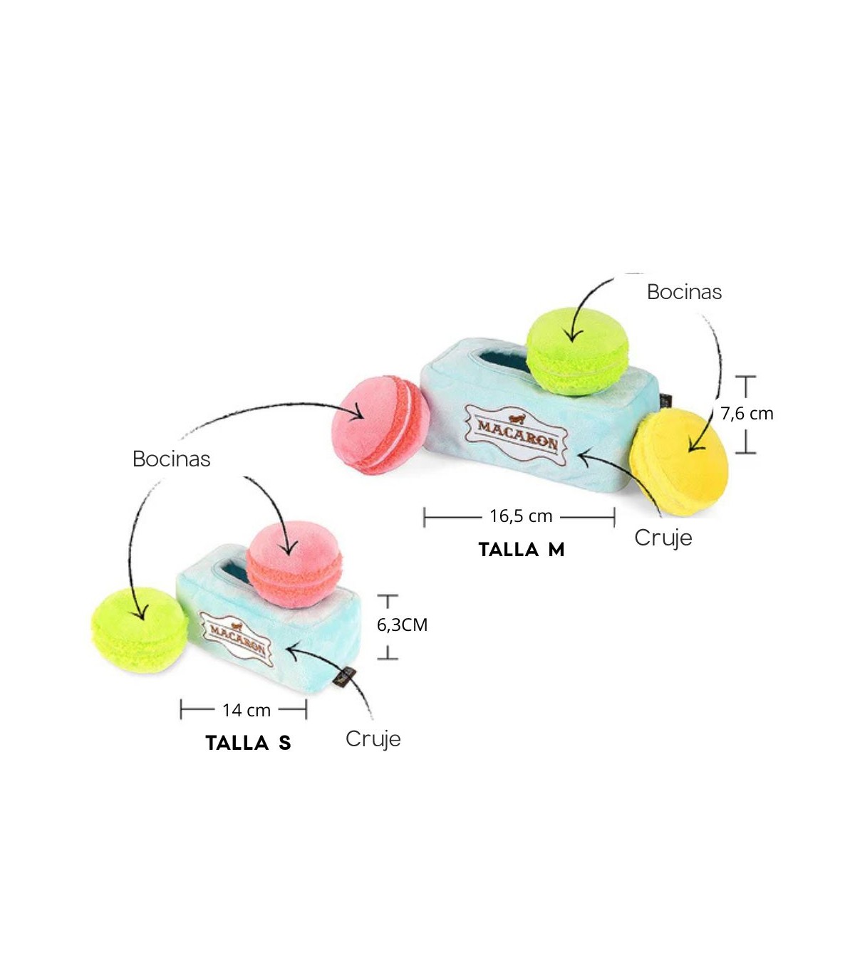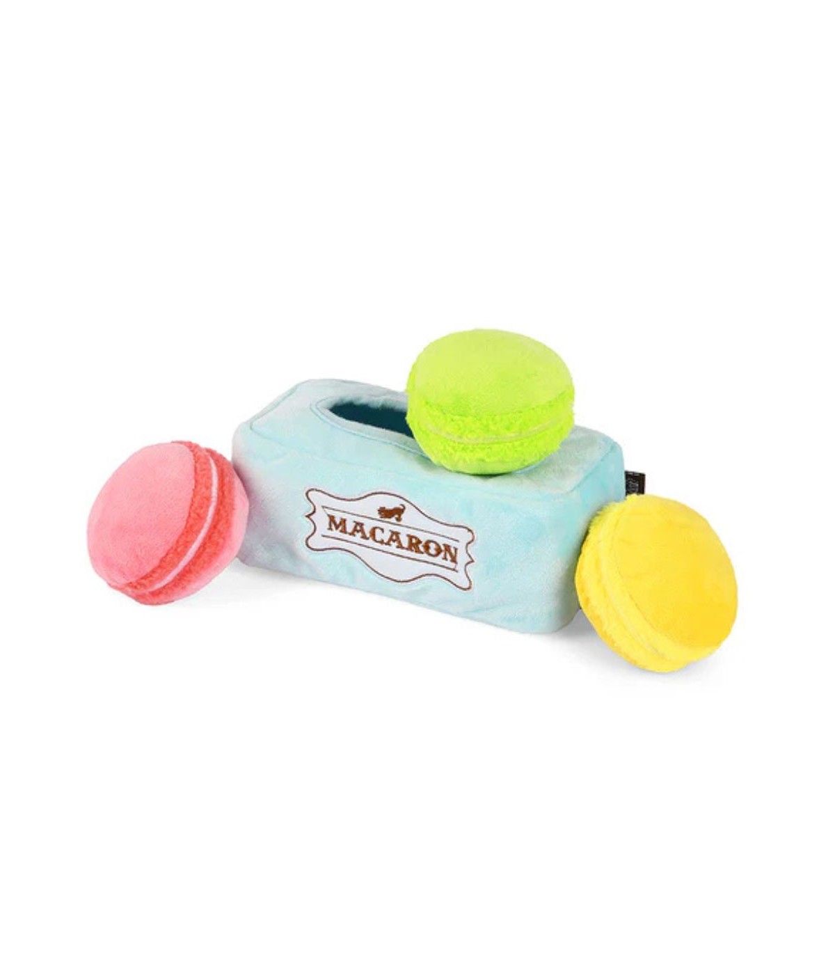 Te vas a enamorar de este irresistible peluche de macarons. Cada macaron tiene una pequeña bocina y funciona como juguete por separado, perfecto para perros más pequeños. Además, aunque son blanditas, las paredes de la caja crujen con cada mordida.
