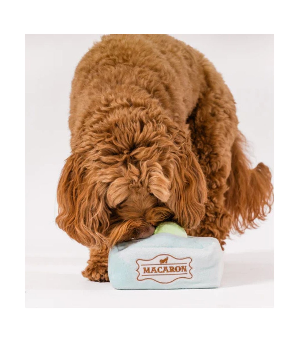 Juguete para perro de la marca P.L.A.Y. Este peluche con forma de caja macarons es suave, blandito y muy versátil.