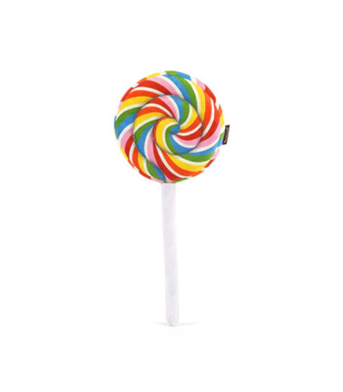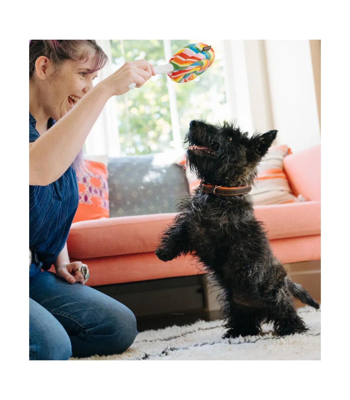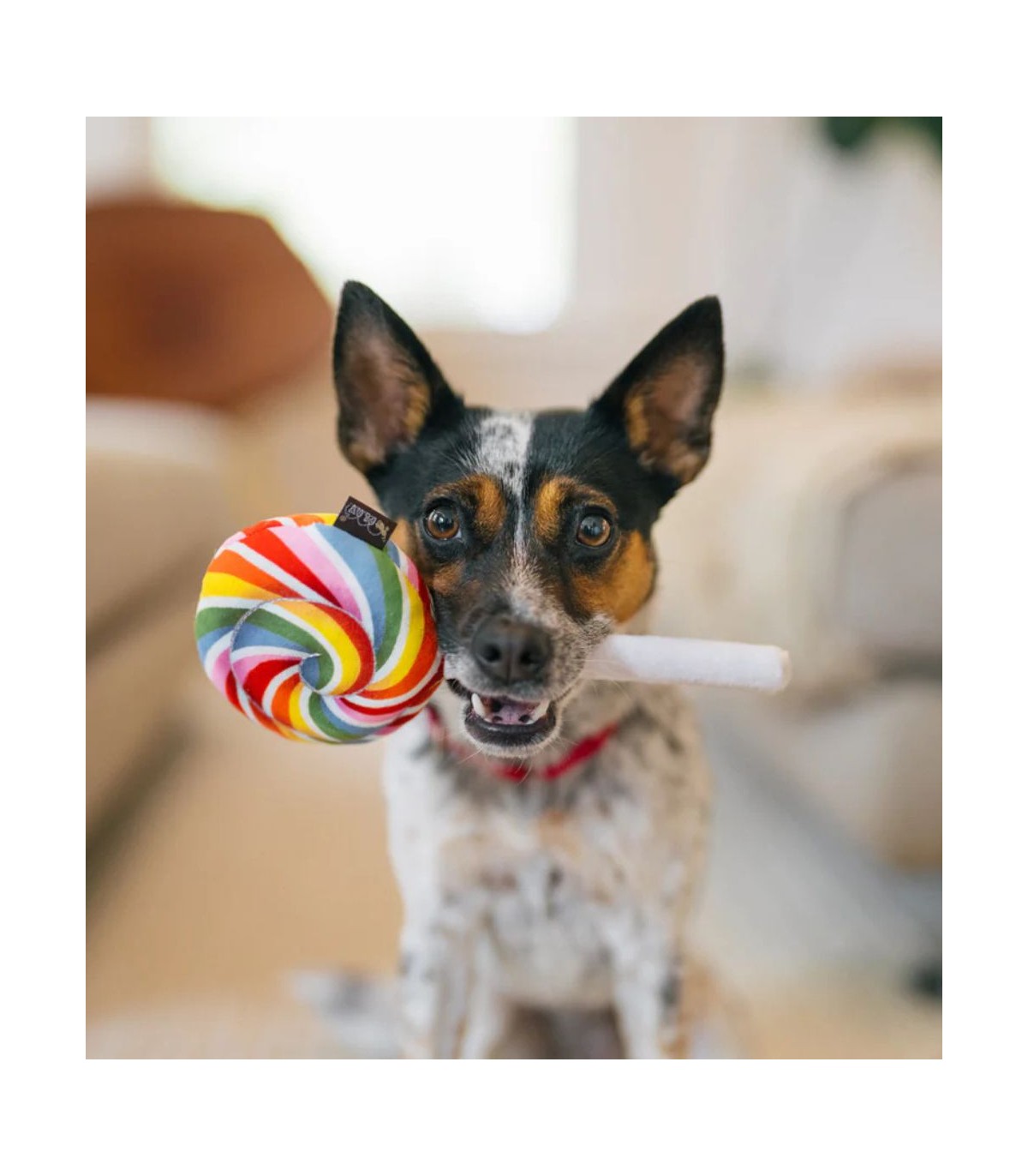 Juguete para perro de la marca P.L.A.Y. Este peluche con forma de Piruleta es suave y blandito.