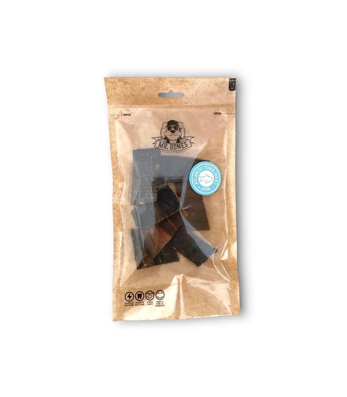 Snack para perros de boquerón natural. Elaborado a partir piel y carne de atún del Atlántico. Sin aditivos, solo atún cortado en trocitos. Es rico en minerales y tiene un alto contenido en ácidos grasos como el Omega-3.