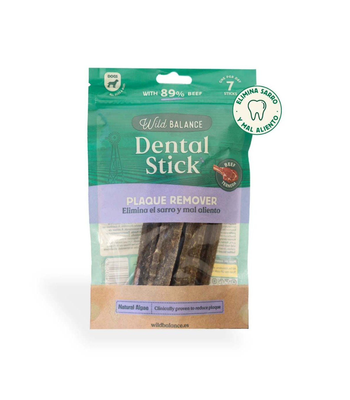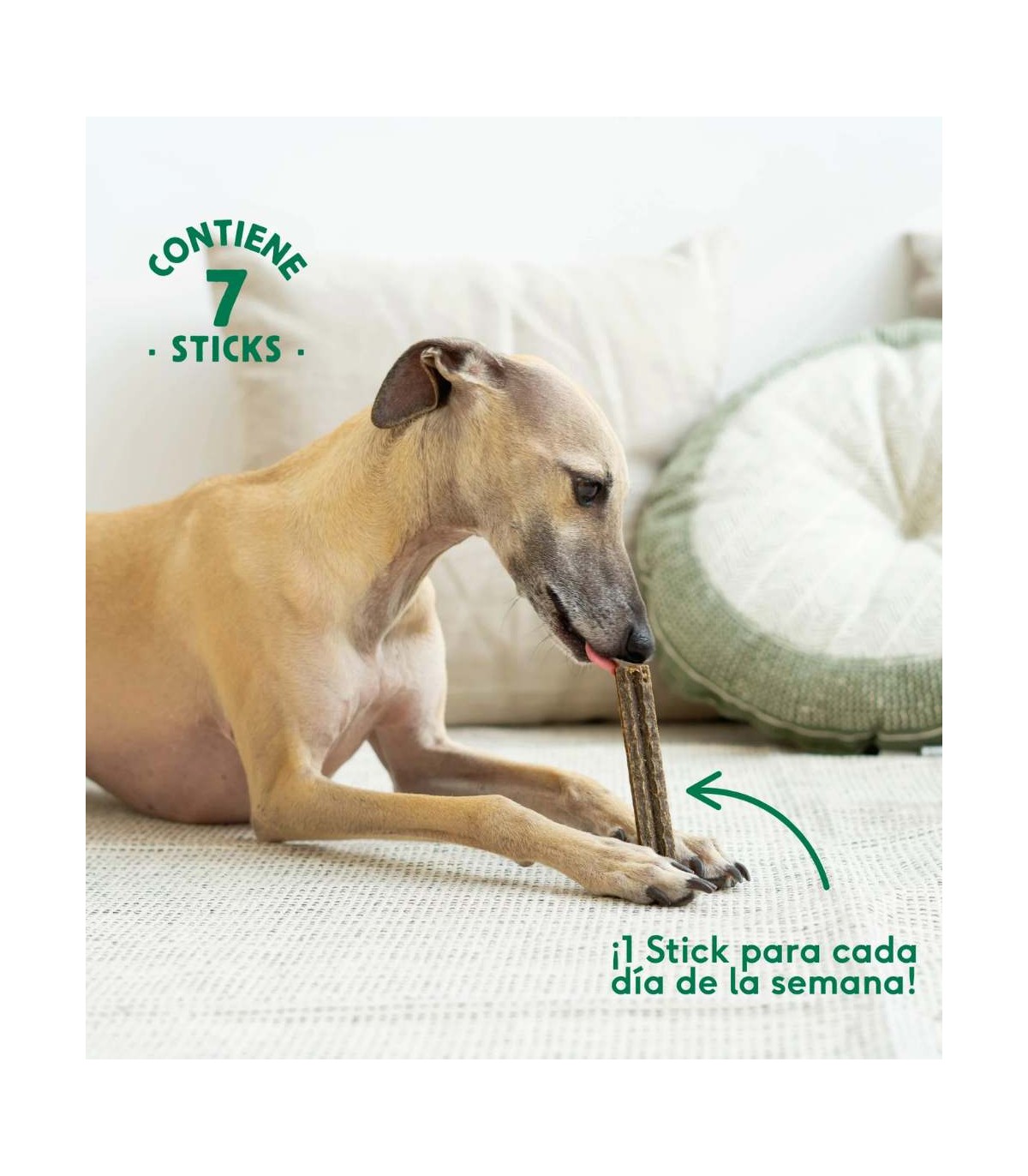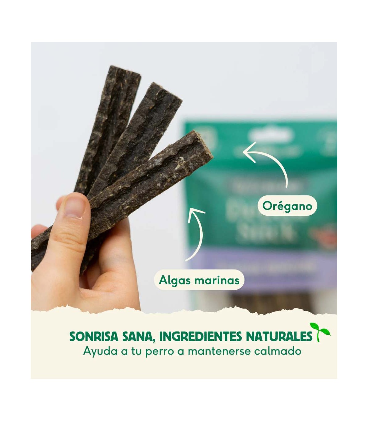 Cada stick dental está elaborado con un 89% de ternera deshidratada y algas marinas que previenen la aparición de placa y sarro dental. Además, incluye también orégano que ayuda a refrescar su aliento.