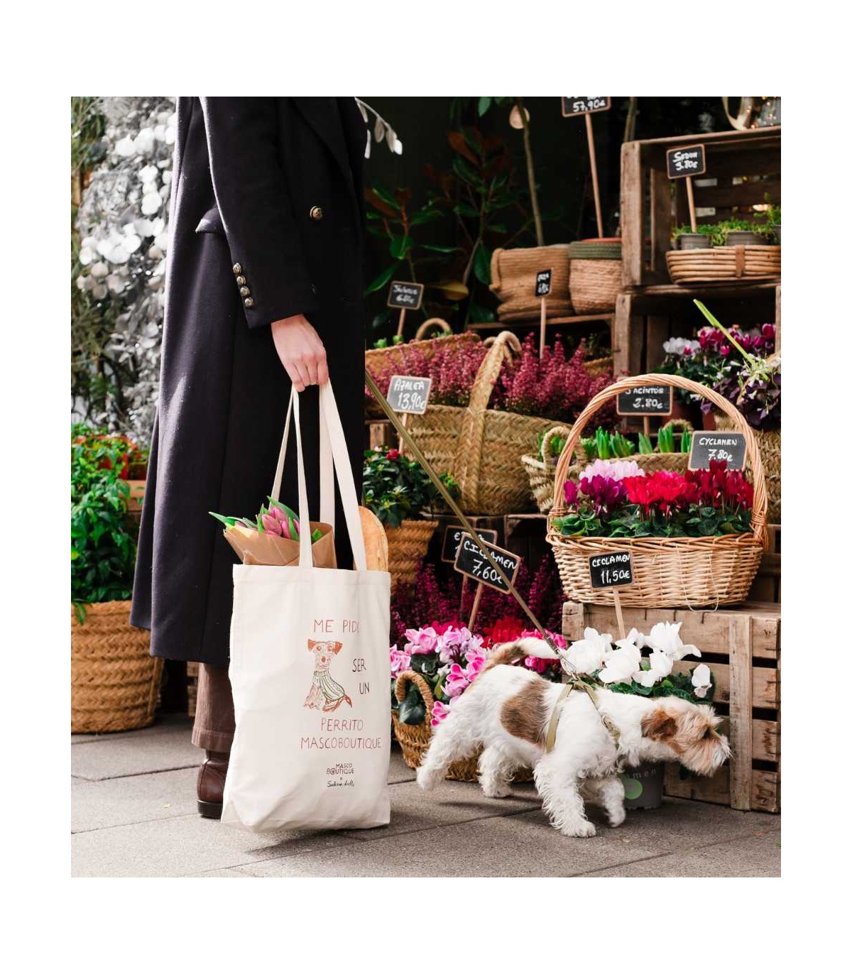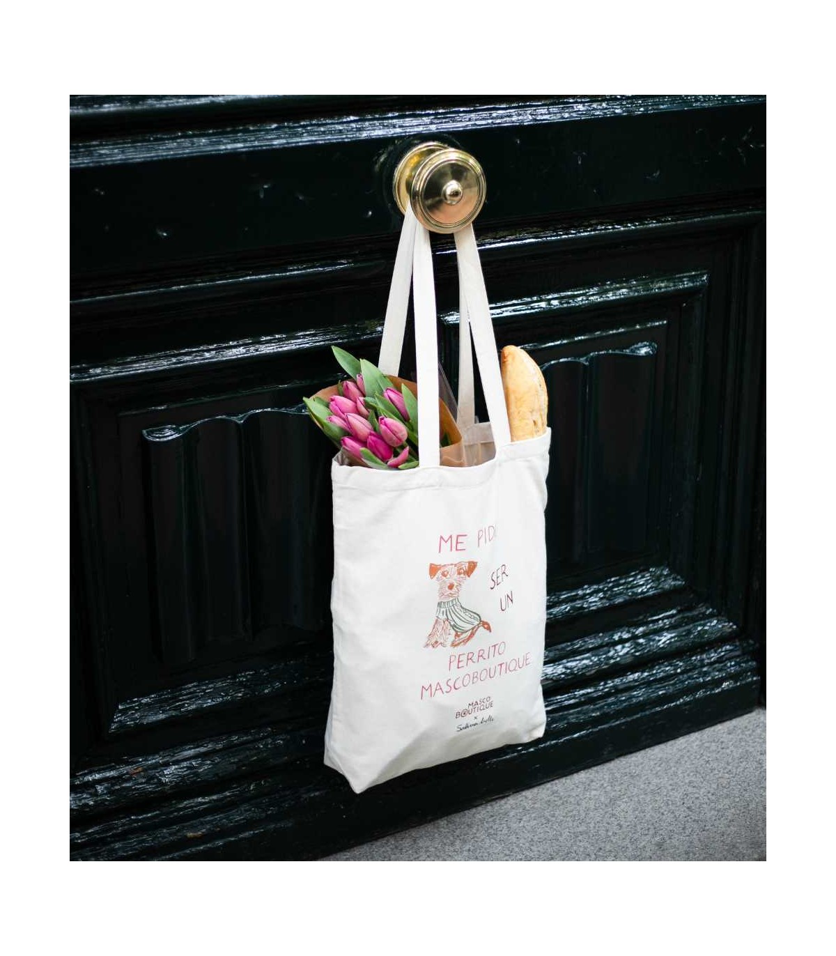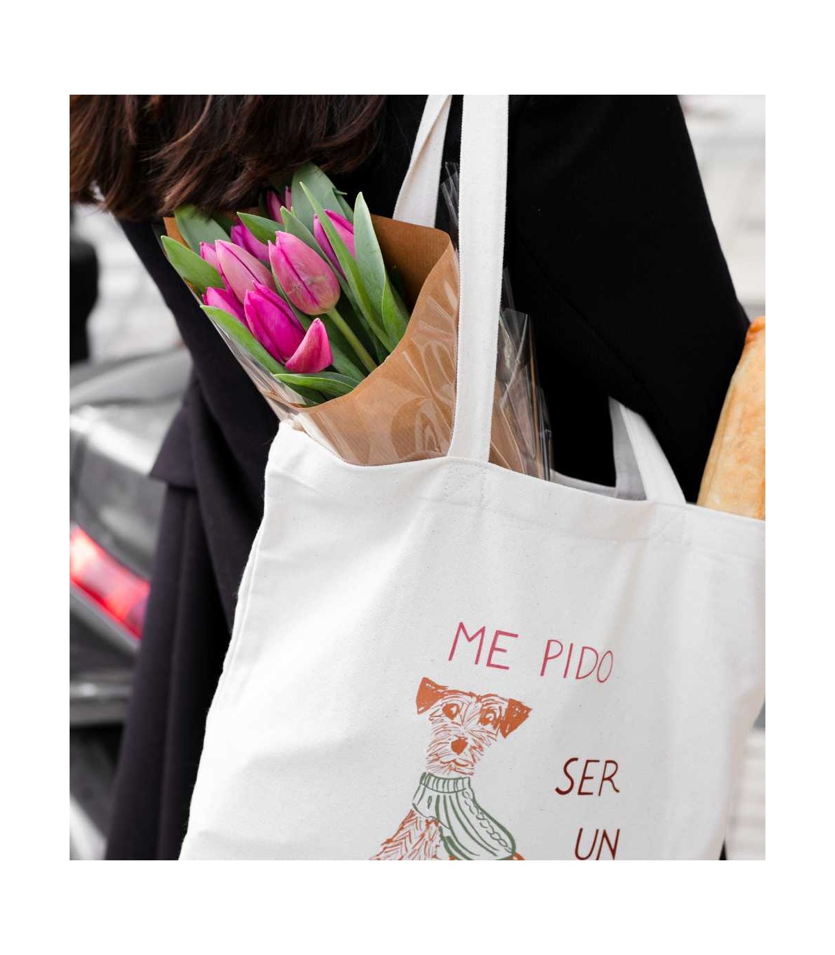Fabricada en 100% algodón, es muy resistente, ligera y con gran capacidad, ideal para acompañarte en cualquier plan: un paseo con tu perrito, una tarde de recados o simplemente como bolso diario. Gracias a su fondo con fuelle y sus asas largas con costuras reforzadas, resulta muy cómoda de llevar al hombro incluso cuando va llena.